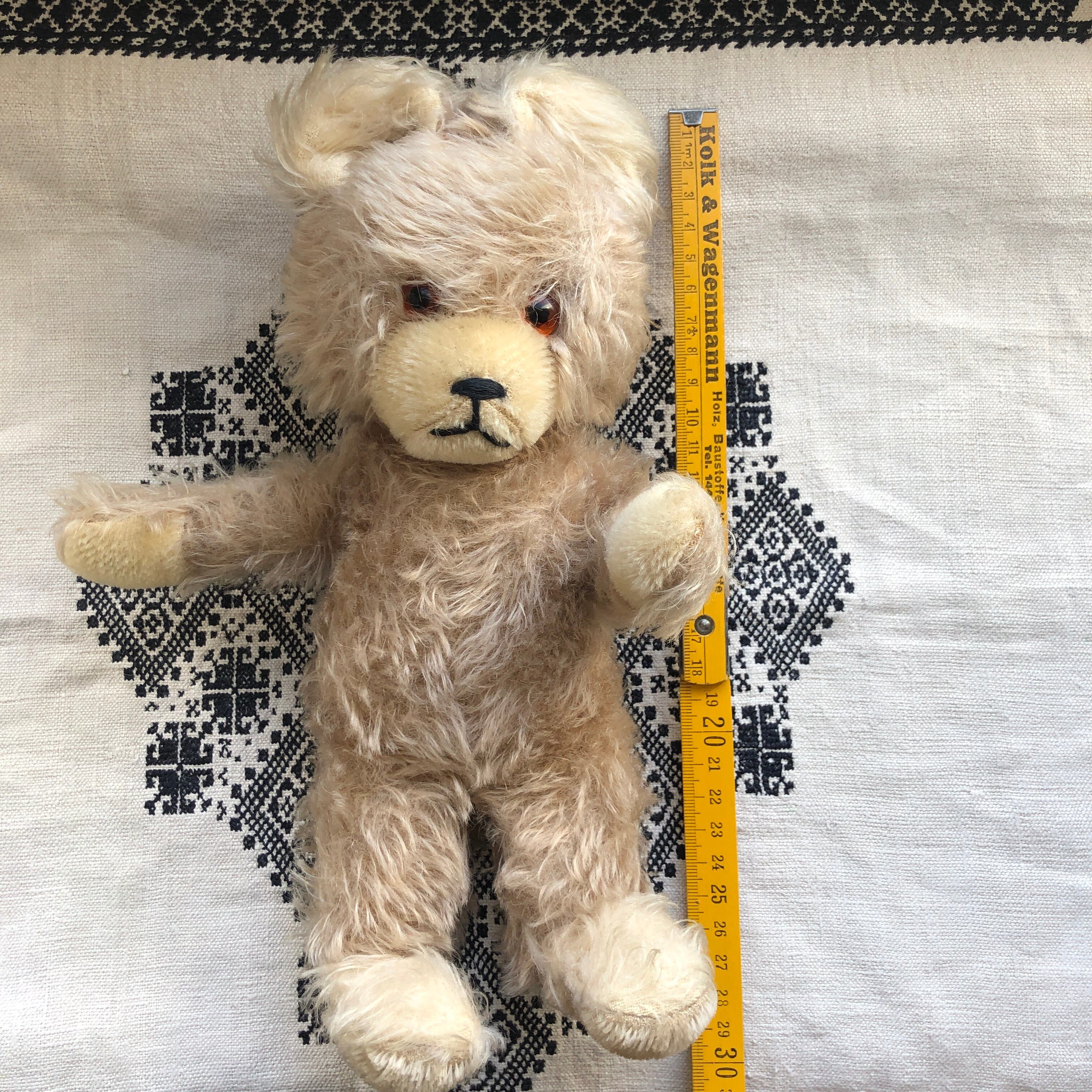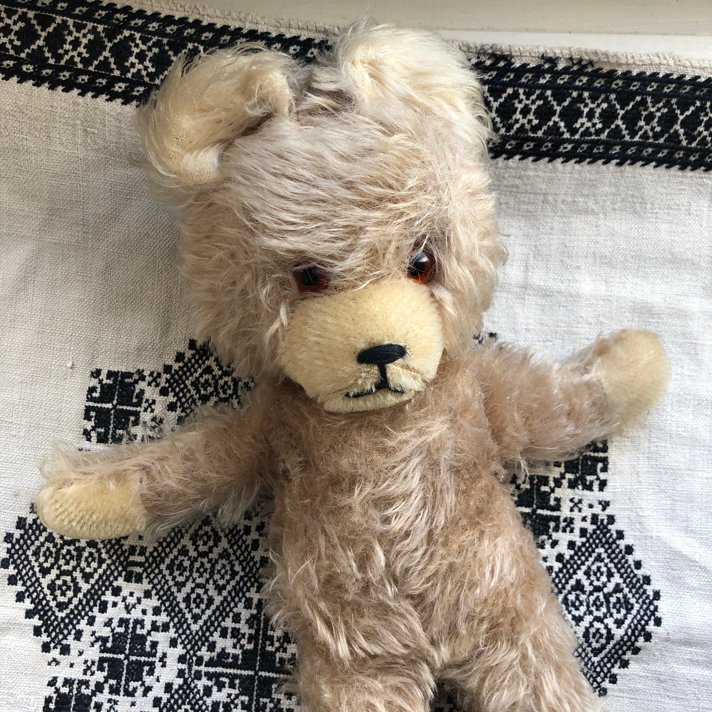 モヘアにグラスアイ。頭は木毛が詰め込まれています。ボディは硬めで、中に針金が入っているのがわかります。右手の針金は消失しているのか、そこだけブラブラします。ジョイントは入っていません。