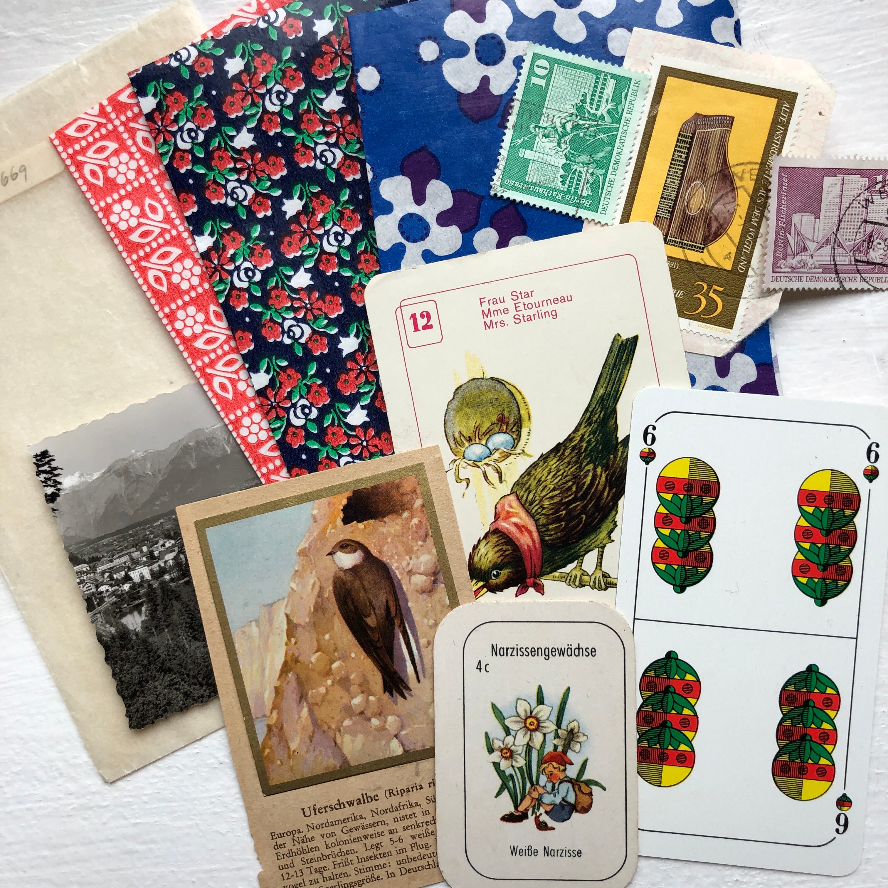 1枚目の写真はカードを中心としたセット。トランプやカードゲームのカード、DDRのヴィンテージペーパー、図鑑のような本に貼られた鳥のカードの切り抜きなどなど、紙もの好きさんにはたまらないさまざまなアイテムがぎゅっと詰まったセットです。全部をコラージュしても、1枚ででも飾ってみたらかわいいと思います。