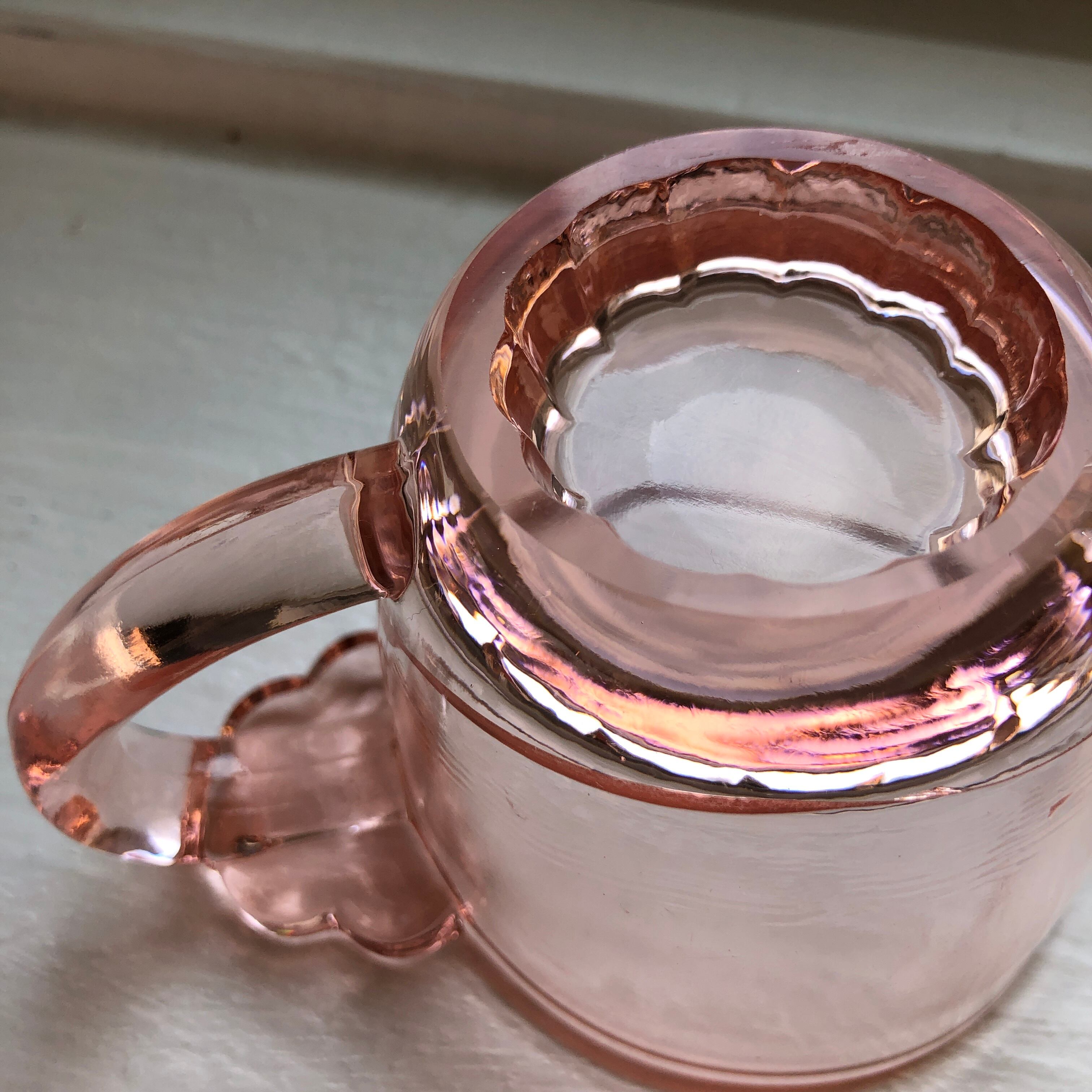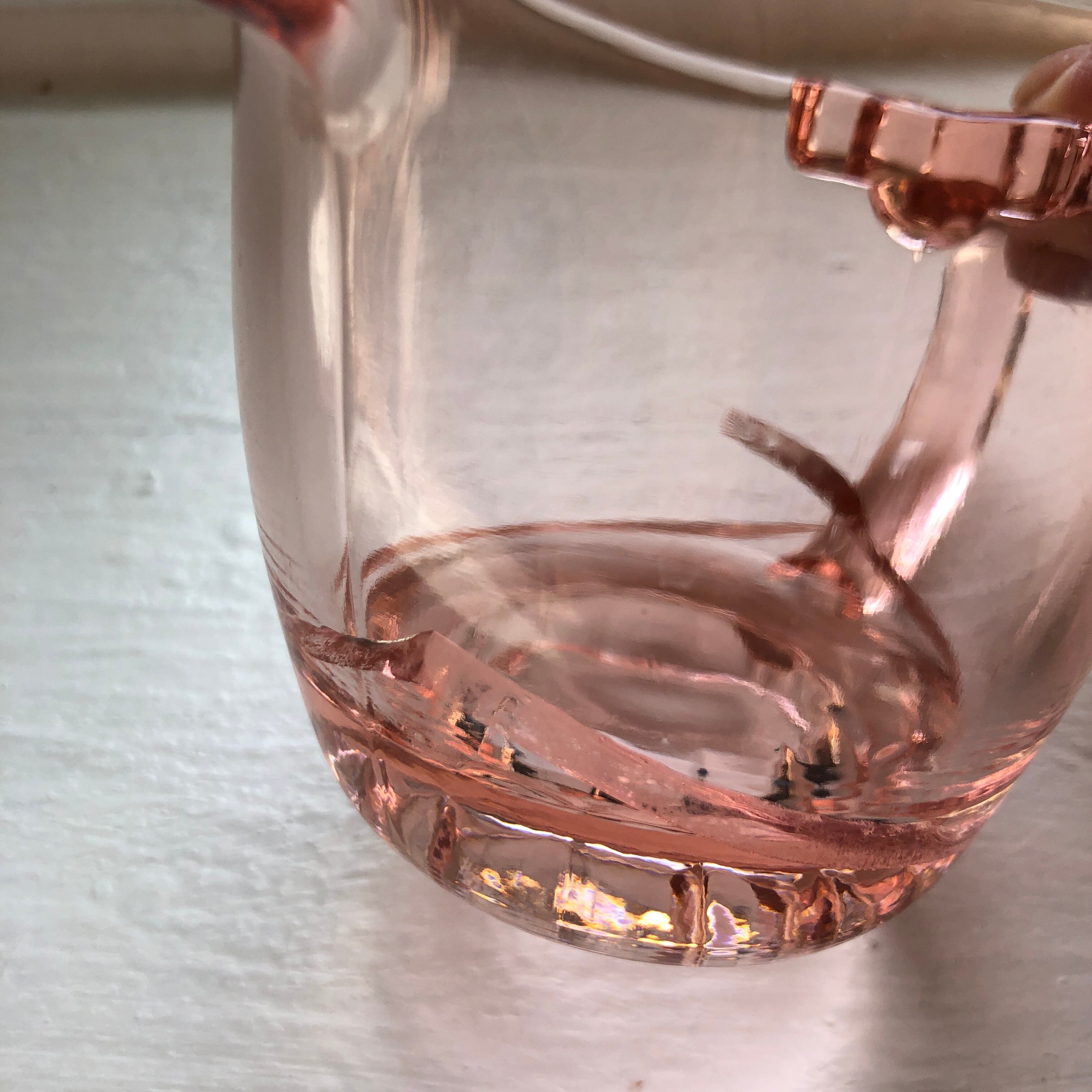 ロザリンガラスと呼ばれる、サーモンピンクがきれいなガラスのピッチャーなどのセットです。ドイツ語でローザとは、ピンク色。そこからロザリンと名づけられたものです。それぞれ作られた年代も異なるかもしれませんが、古いもの(写真4~8)で、1950年代に作られています。