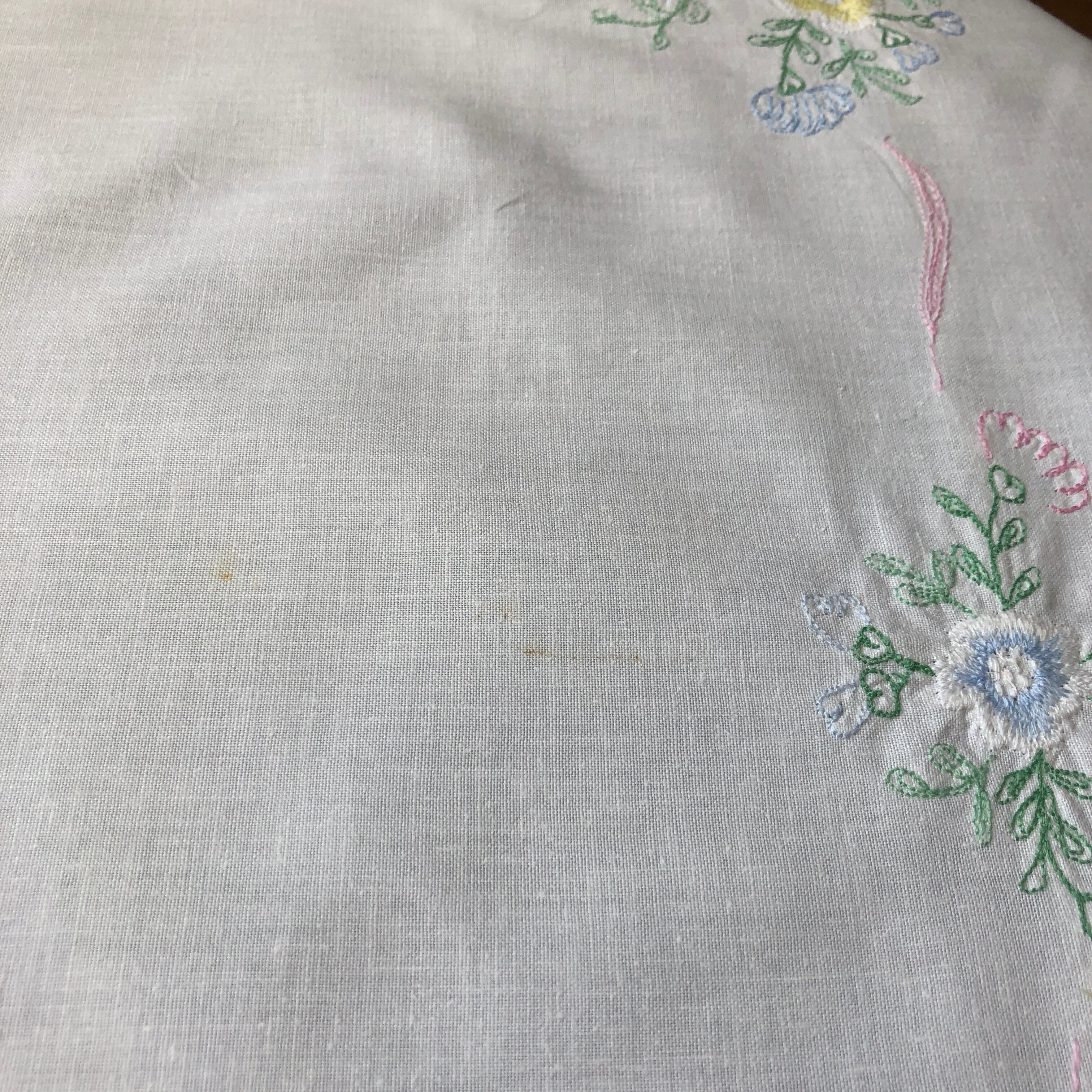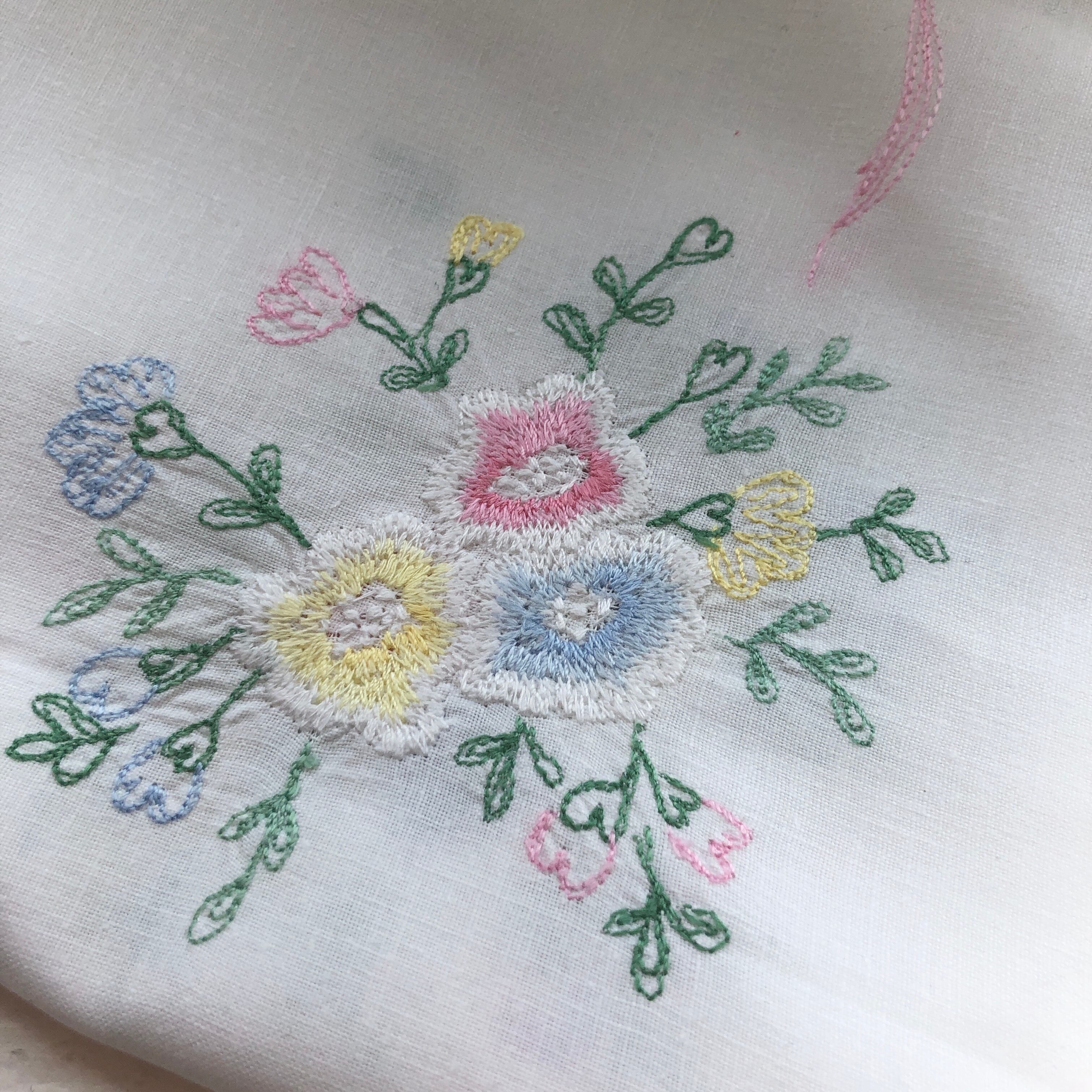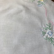 パステルカラーで優しい色合いの機械刺繍のクロスです。周りの縁取りもピンクで、とても甘い雰囲気の一枚です。