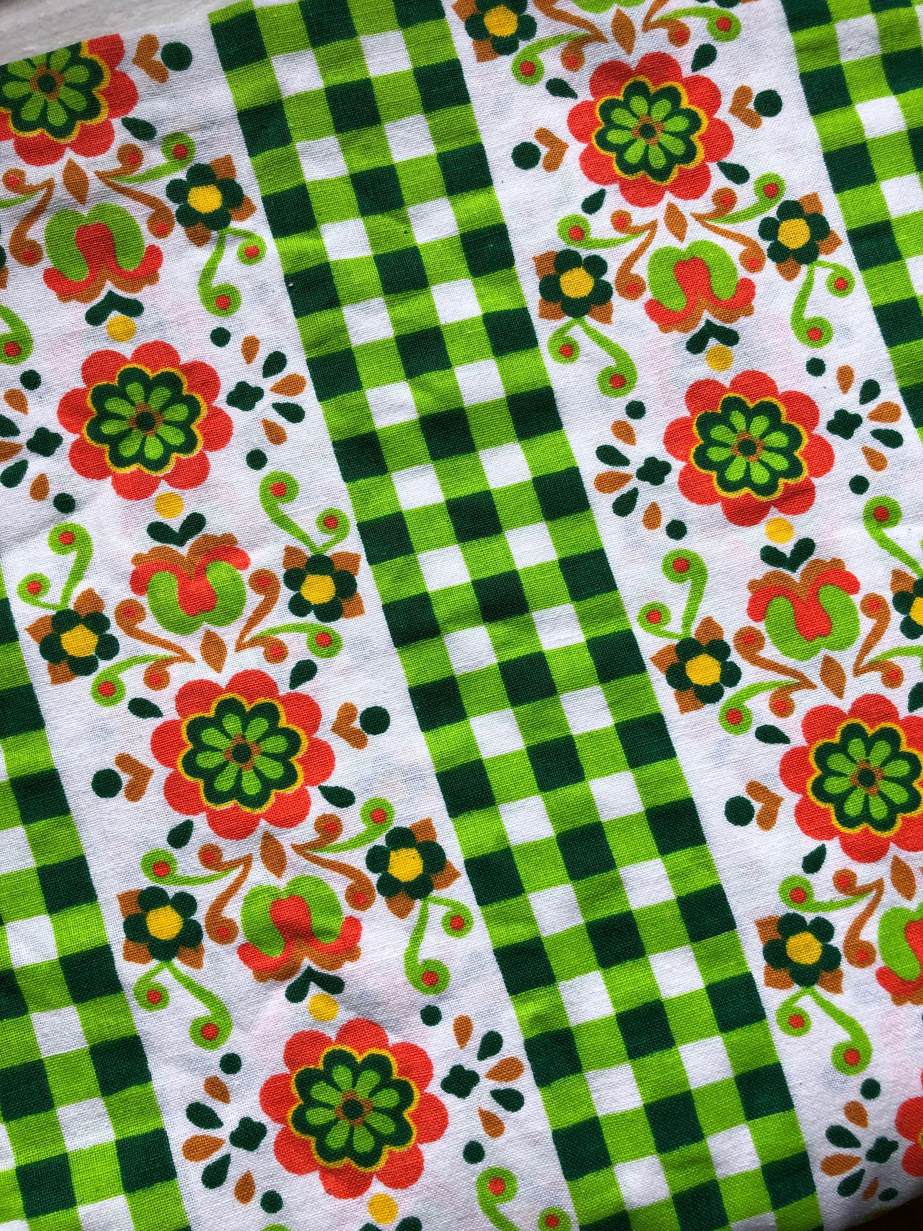 ギンガムチェックの列とチロリアンテープのような花柄の列が交互にストライプのようになっています。ギンガムチェックの幅が約5cm、花柄の幅が約7,3cmです。柄が程よい大きさなので、小さなポーチなども作りやすそうです。