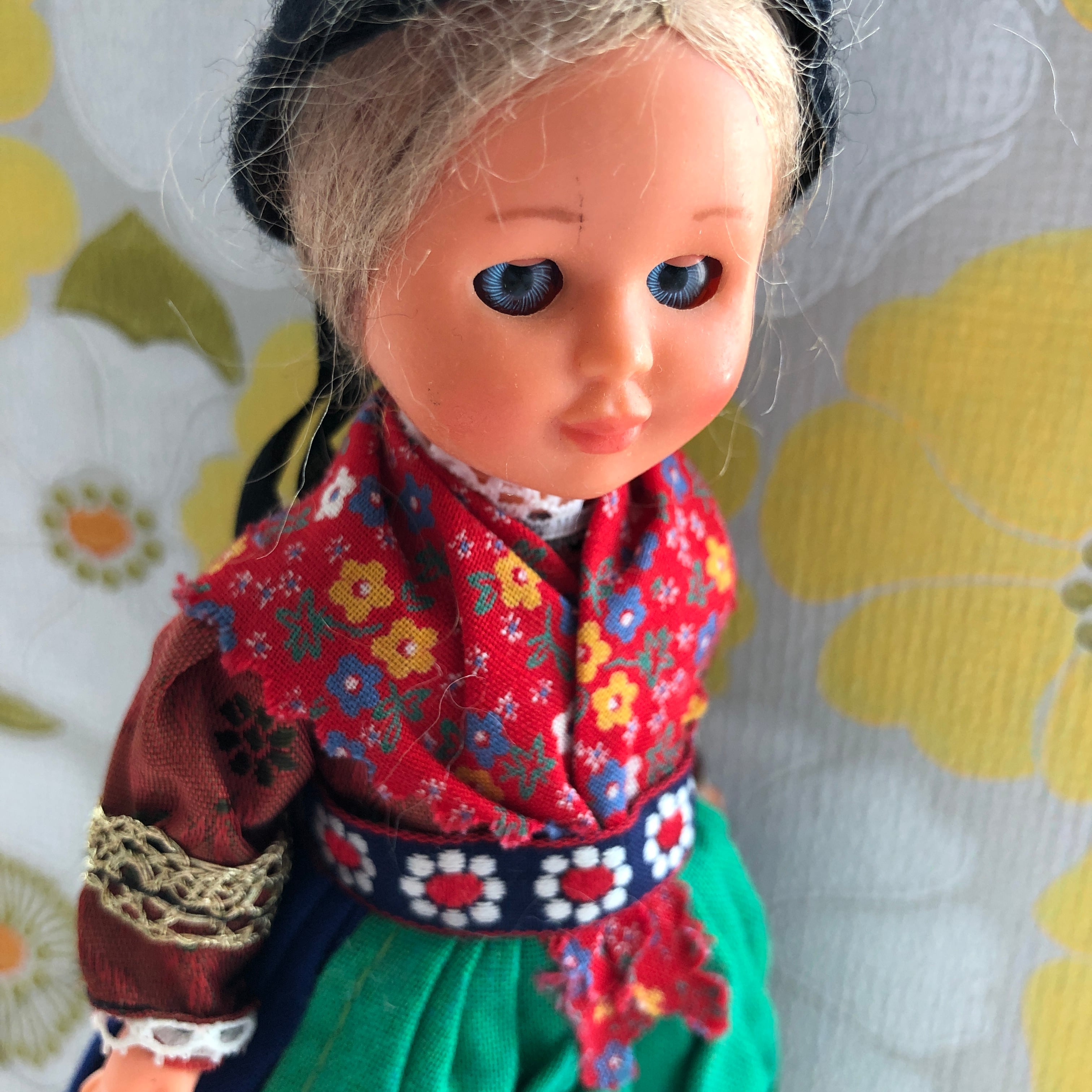 頬を赤く染めた表情がかわいらしい女の子の人形です。