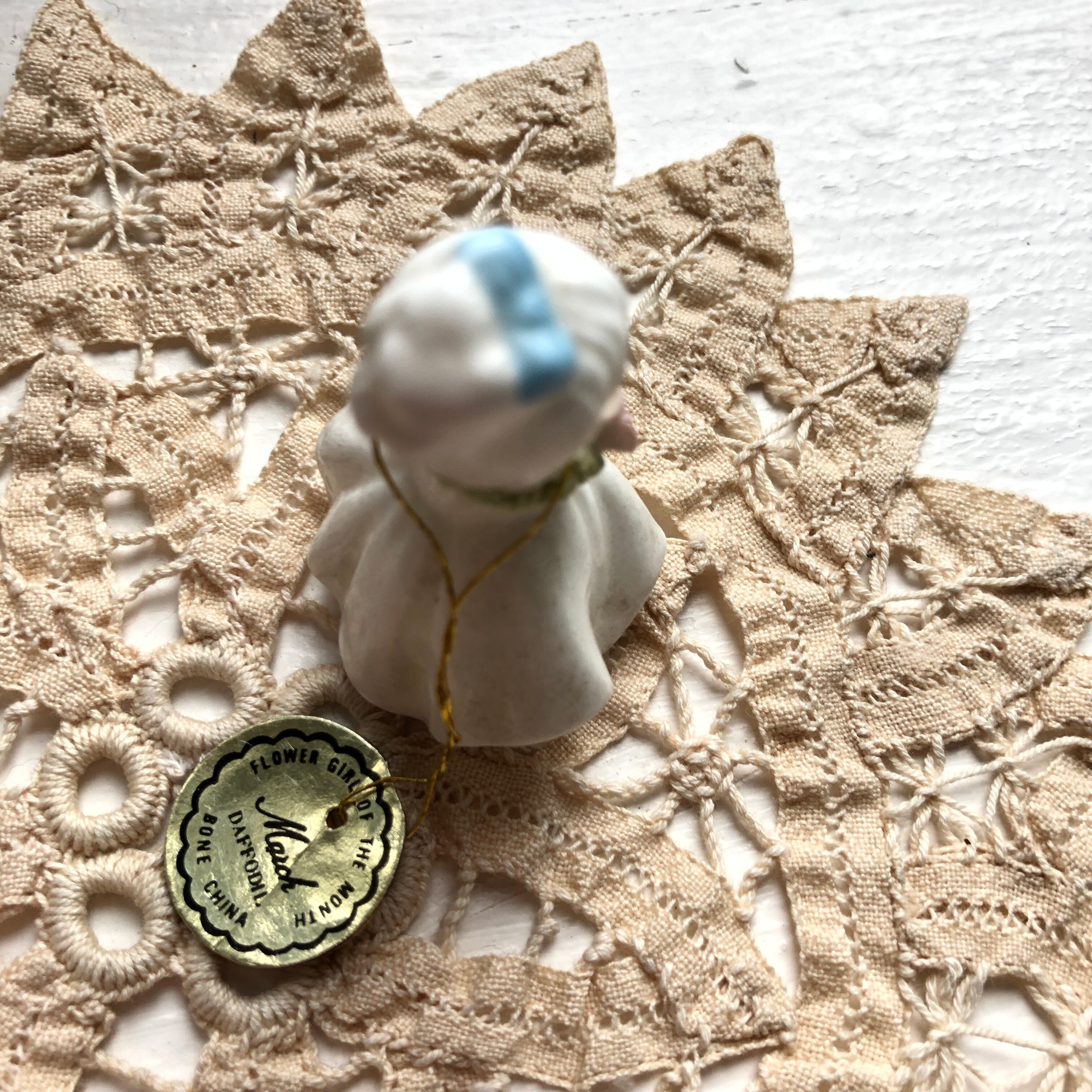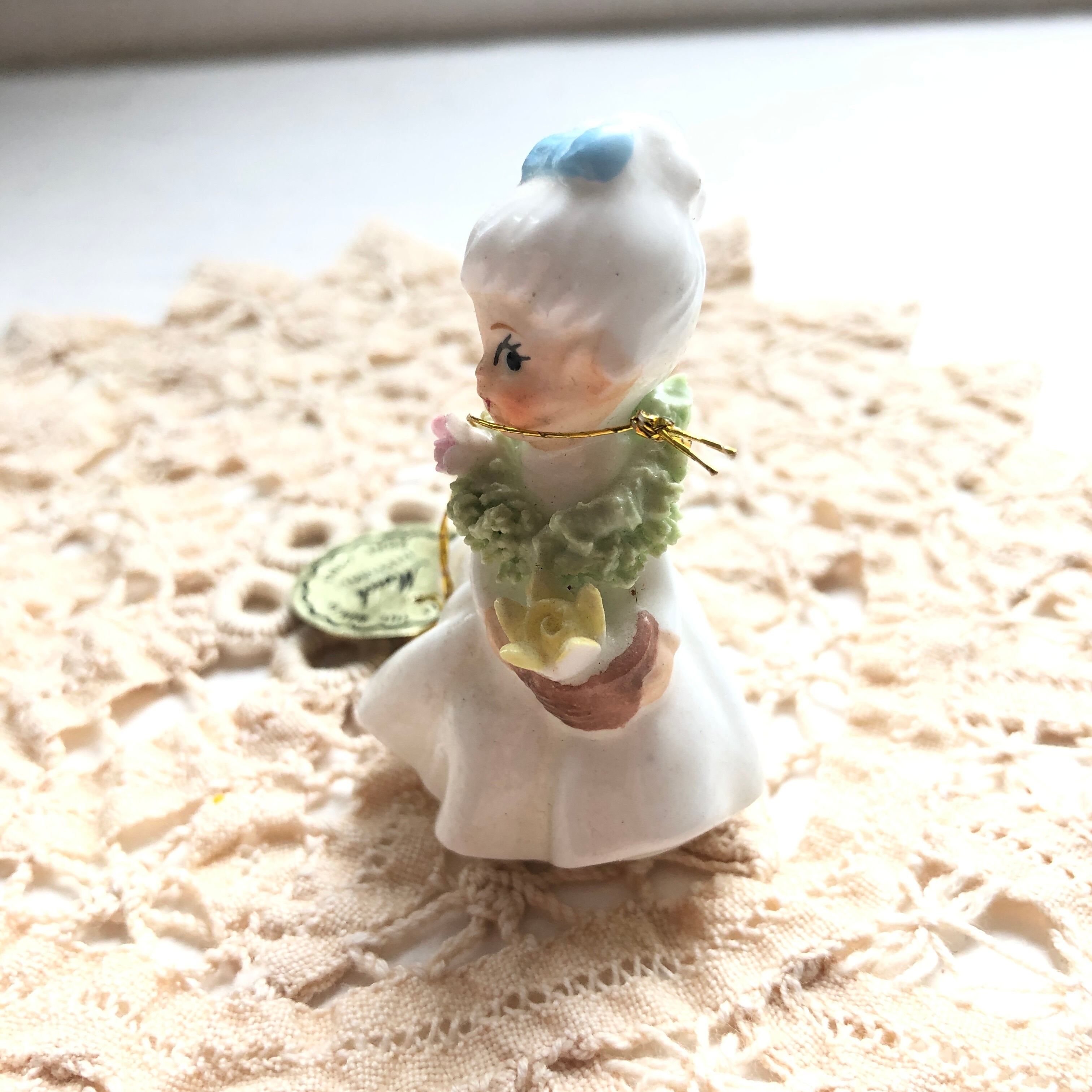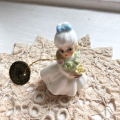 小さな水仙を持ったフラワーガールの置き物です。