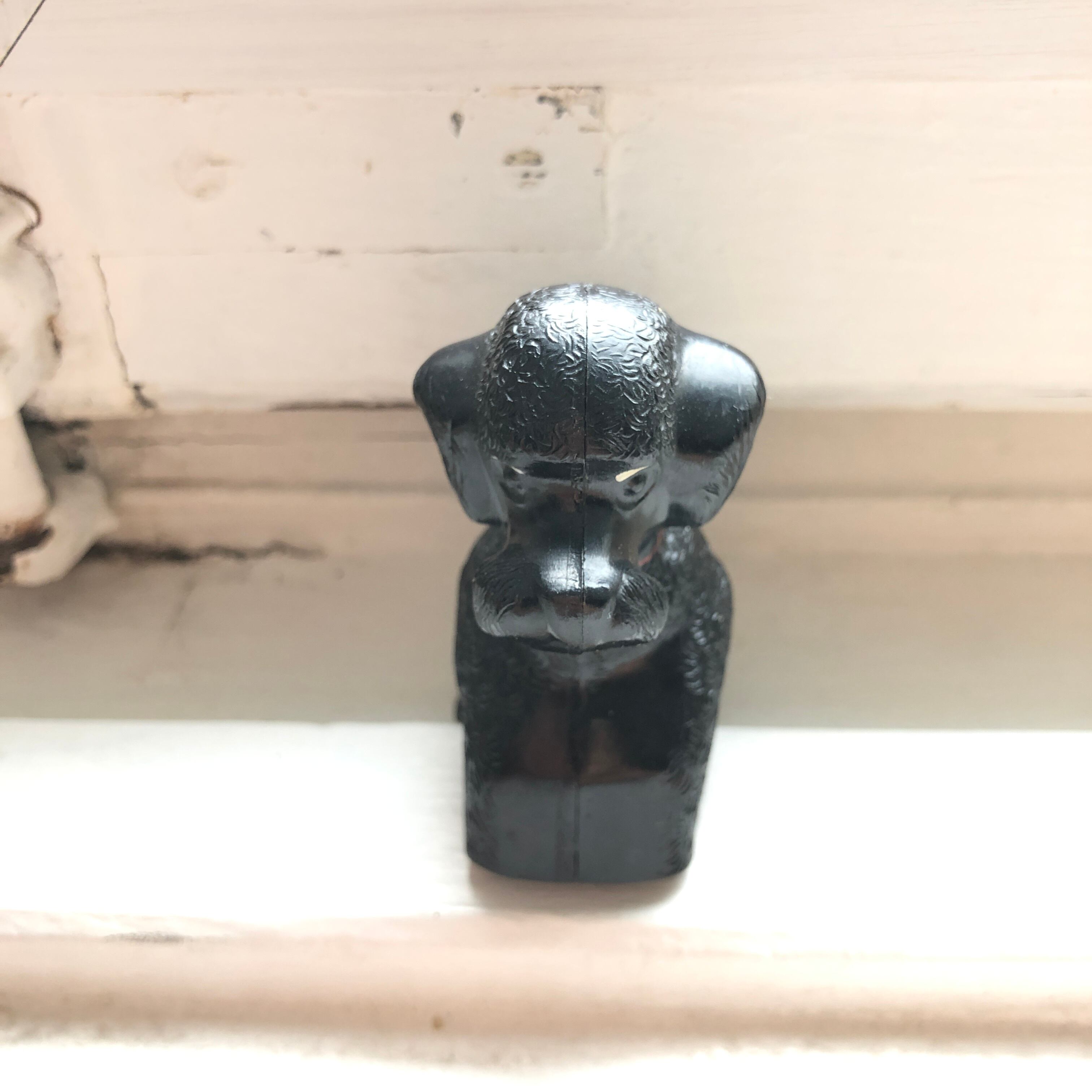 凛々しい顔立ち、細い白い眉、赤い首輪をつけた黒いプラスチックのプードルです。