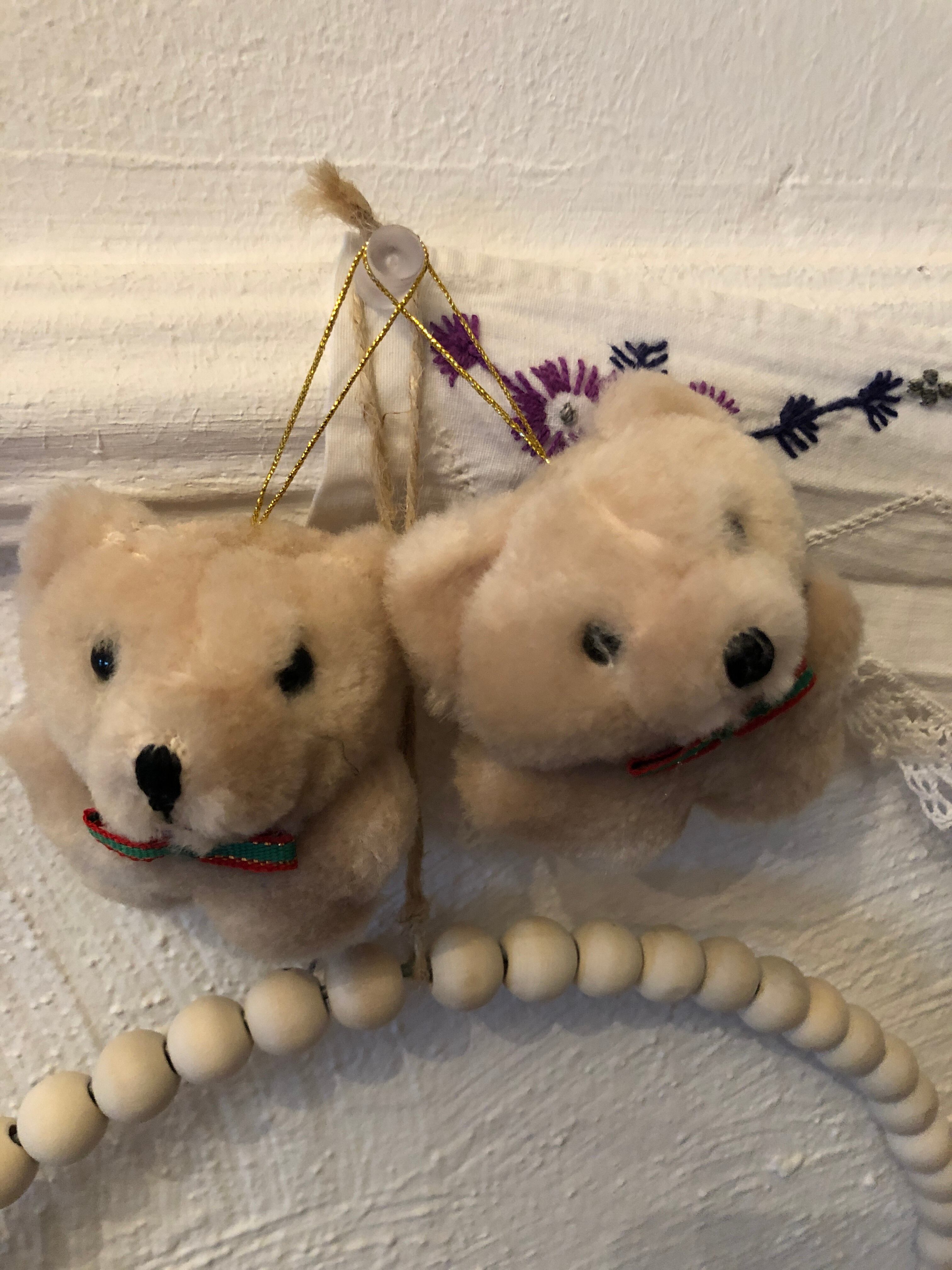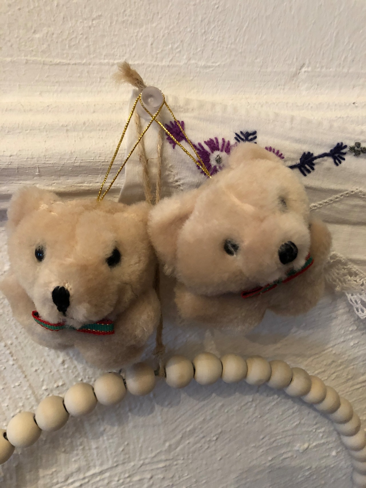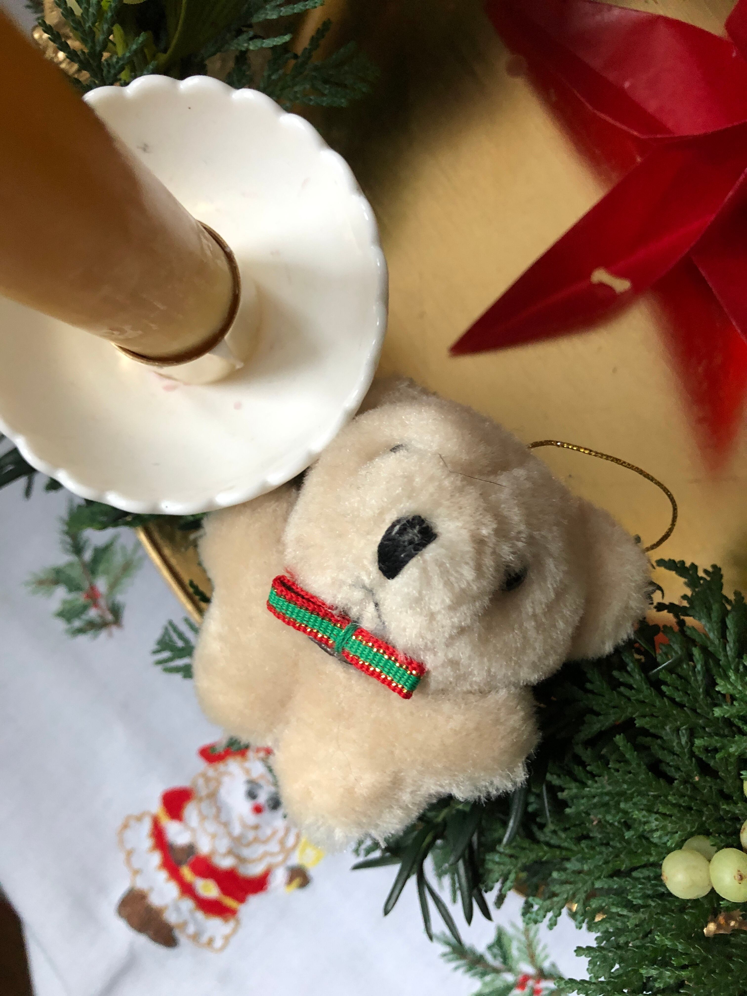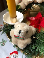 クリスマスカラーのリボン、ぶら下げる紐がついて、クリスマスツリーの飾りとして作られたもののようです。