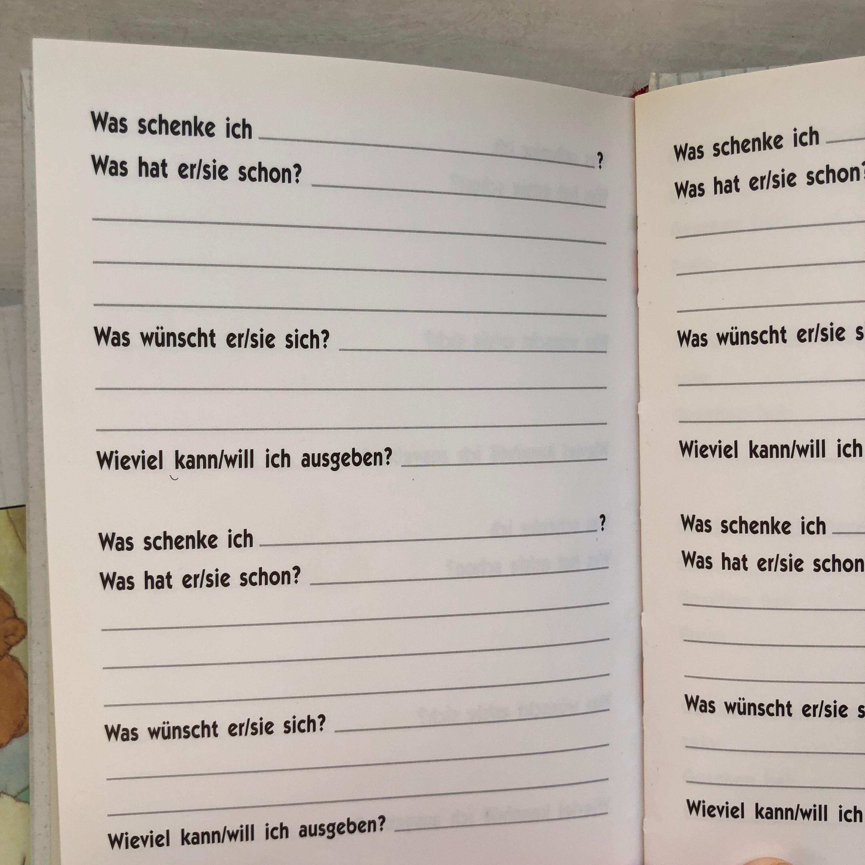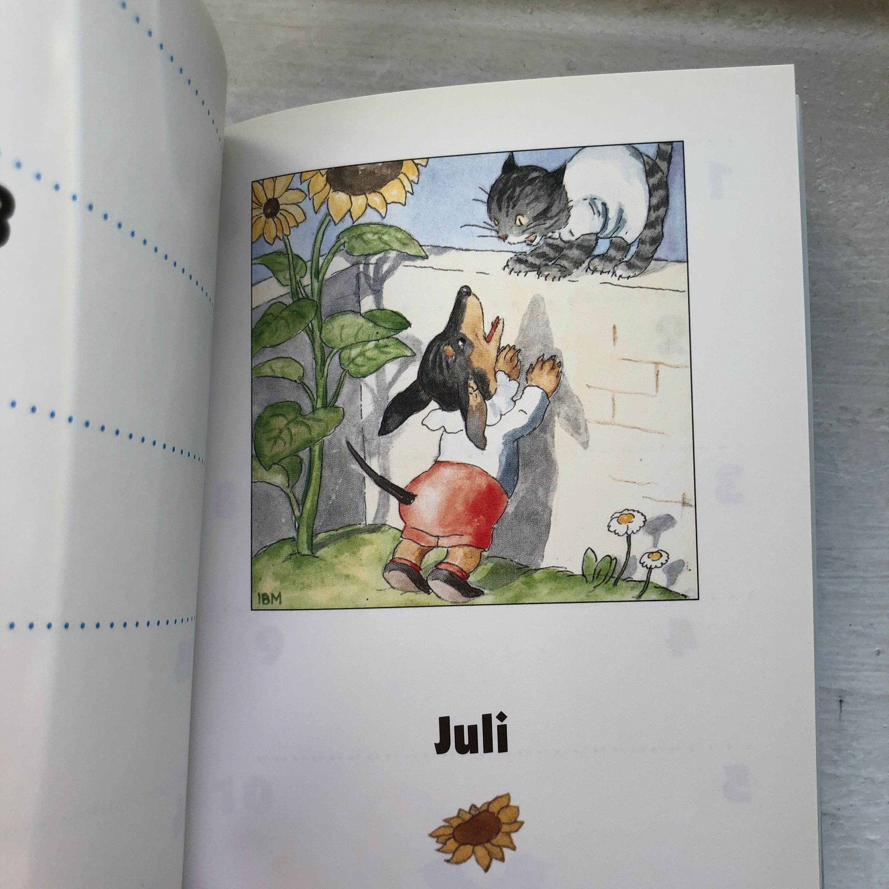 ドイツでは一般的な誕生日カレンダーは、猫のイラスト。ひとつきに2つのイラストが使われています。各月の日付のところに、誕生日の人の名前を書くという仕組みです。巻末には、誕生日プレゼントにまつわるアイデアがまとめられています。