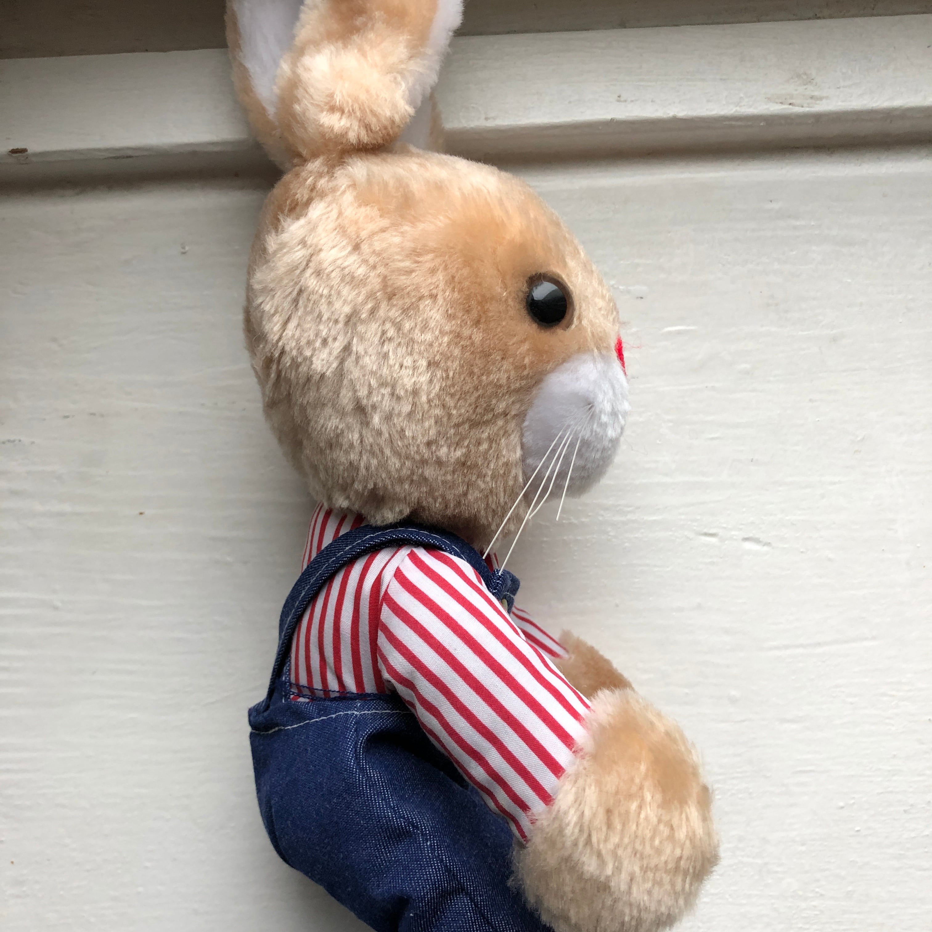 顔ほどの大きさの長い耳を持ったうさぎのぬいぐるみです。ストライプのボディに、オーバーオールを着ています。