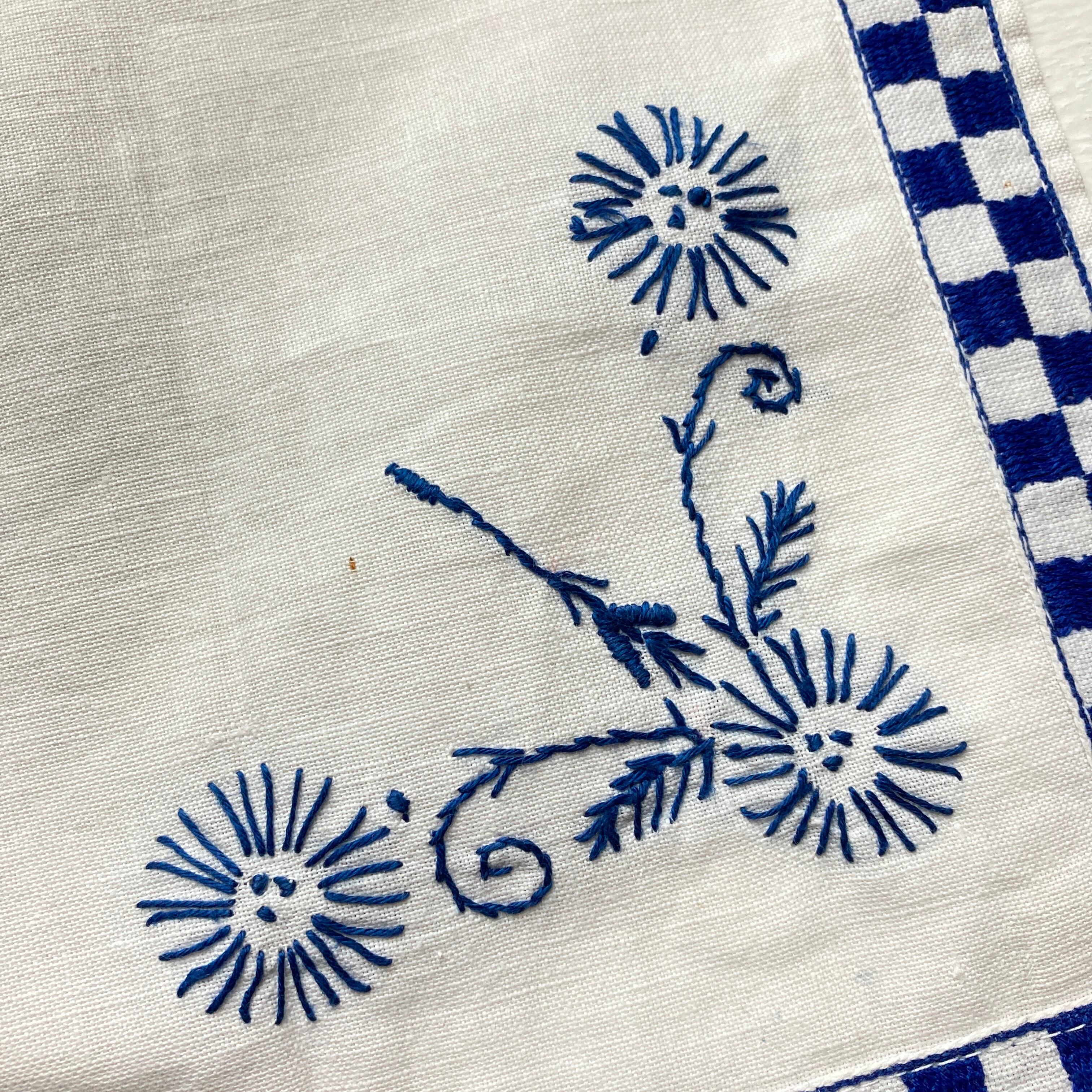 青いバスケットの刺繍のクロス