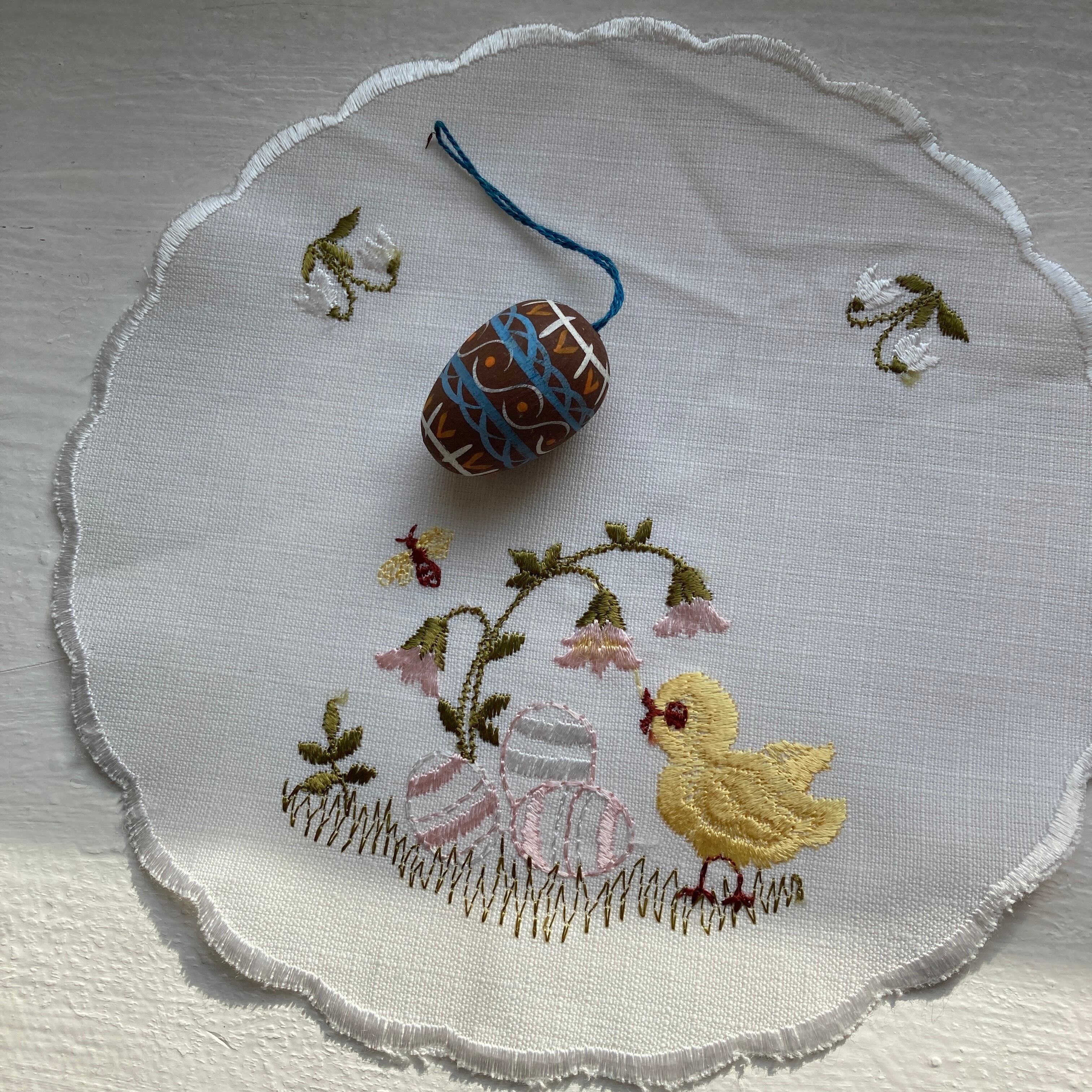 光沢のある糸で刺繍されたひよこ、イースターエッグ、ミツバチなどで春らしい雰囲気の一枚です。