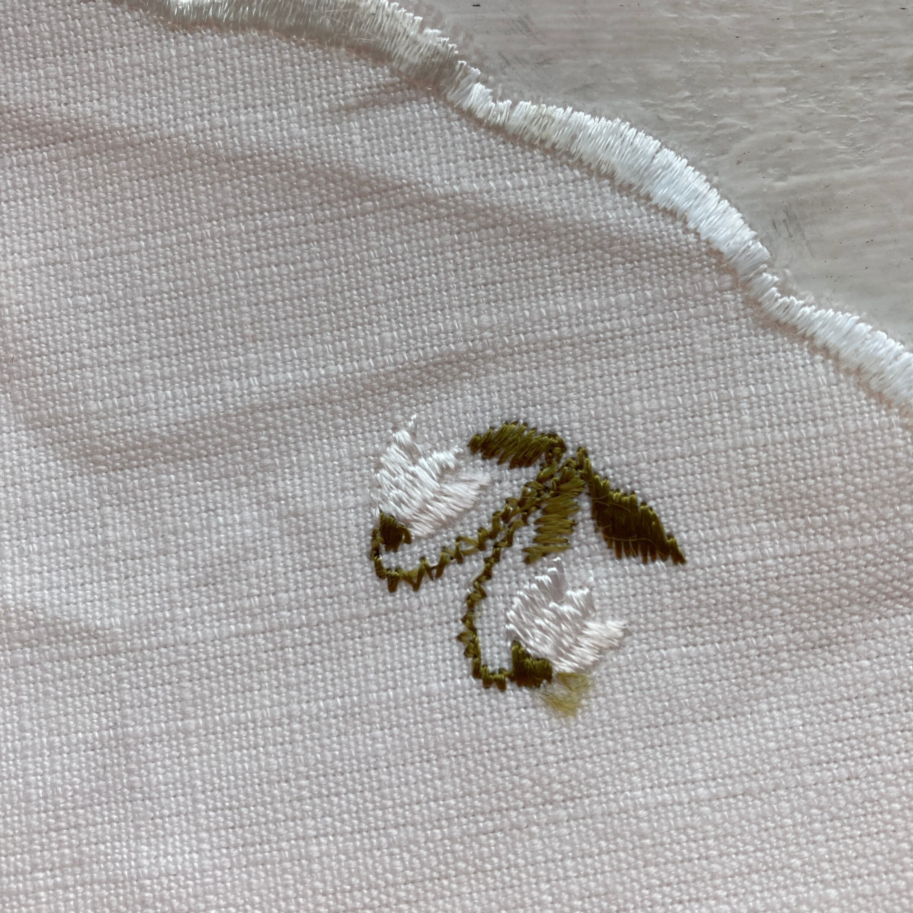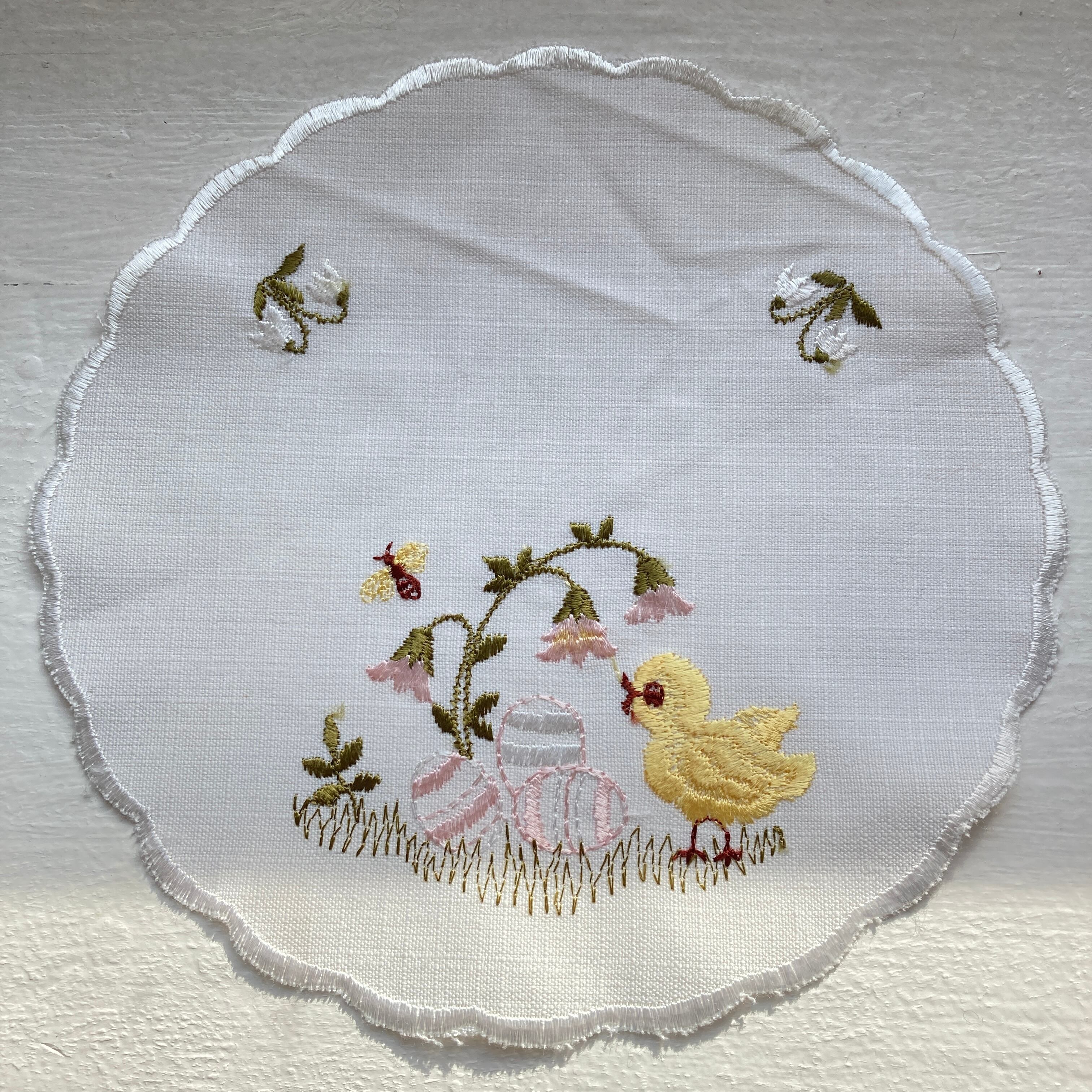 ひよこやスノーベルのようなお花が機械刺繍されたドイリーです。