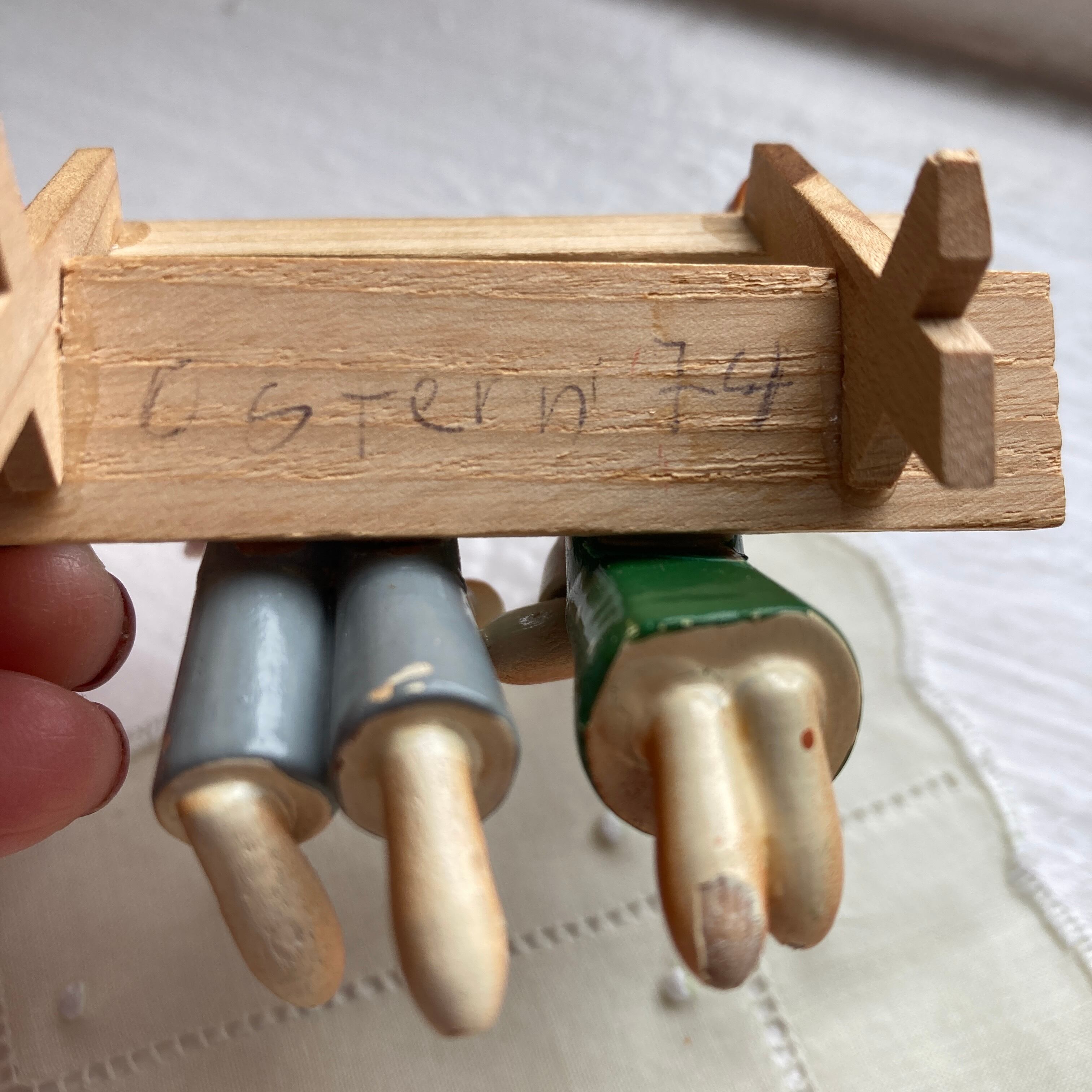 ベンチの裏に、前の持ち主の鉛筆による手書きで、Ostern74とあり、74年のイースターに贈られたりしたものと思われます。
