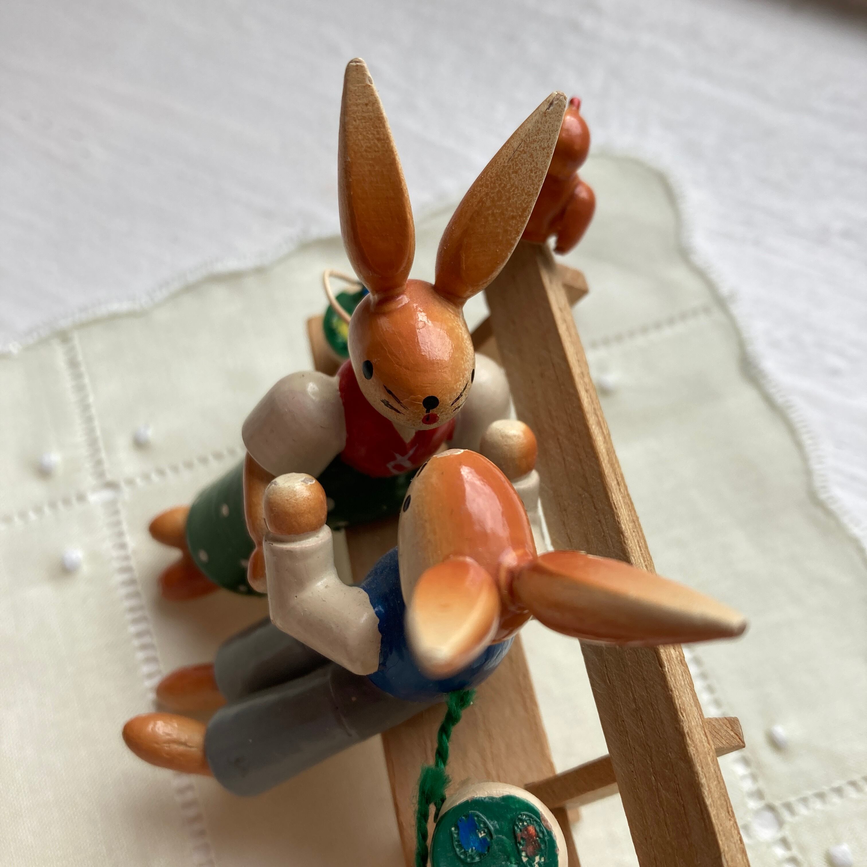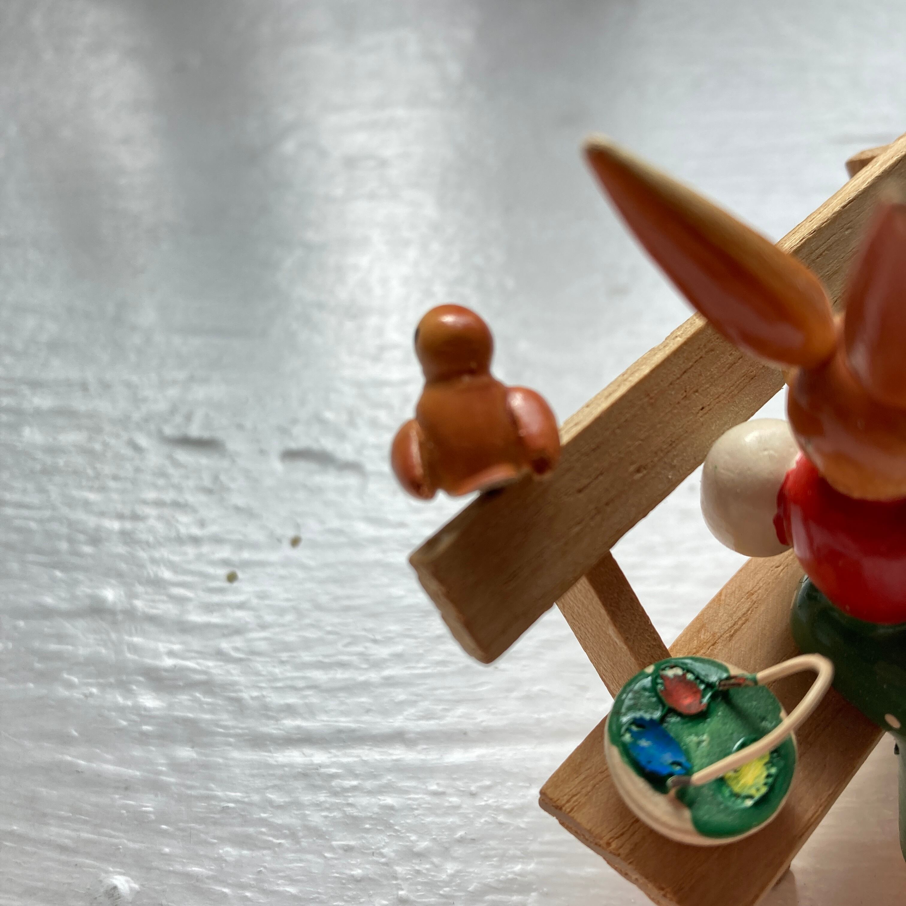ピンとした耳、水玉模様のスカート、片隅にとまった小鳥など、ディテールがとてもかわいい木の置き物です。エルツ山地のESCO社で作られた工芸品です。