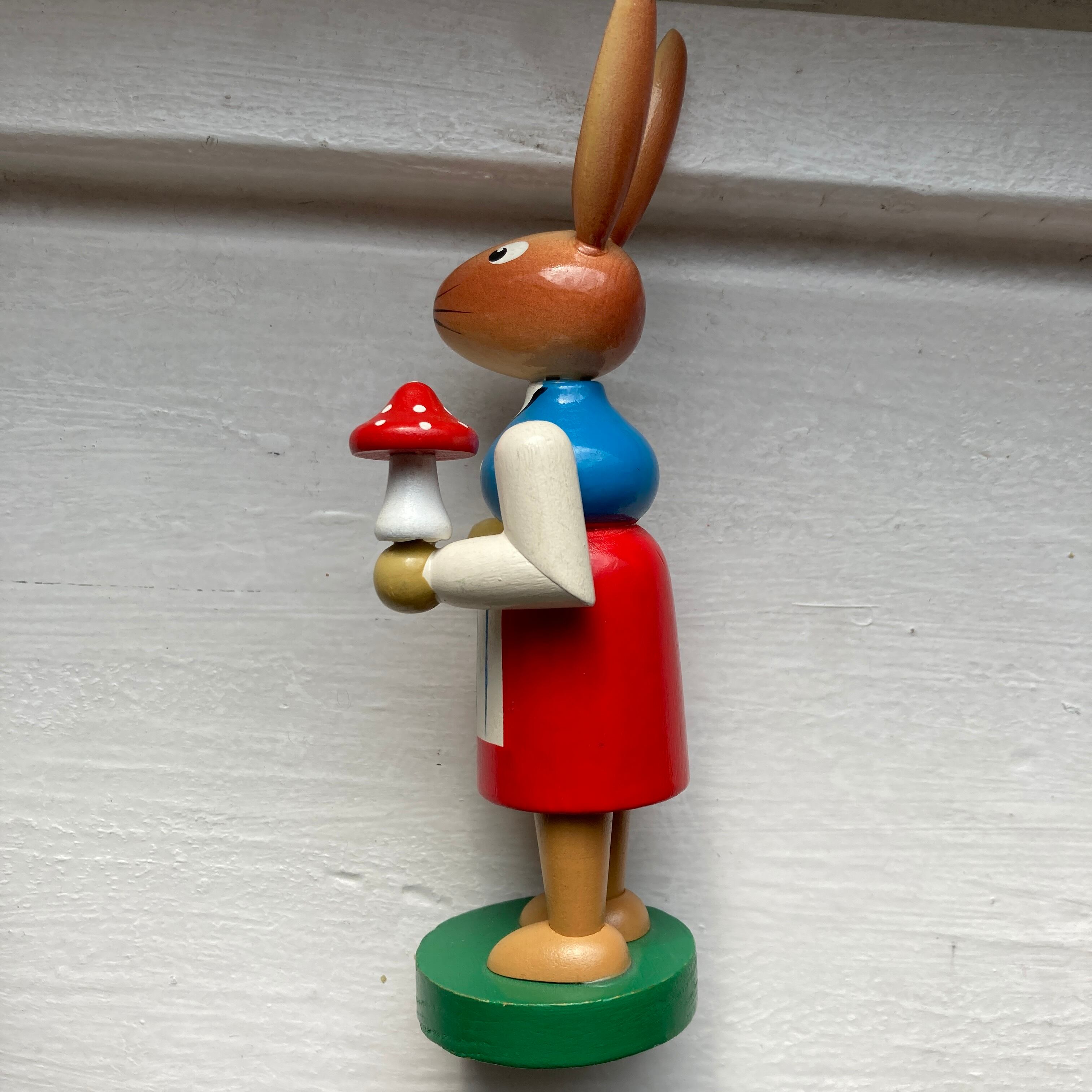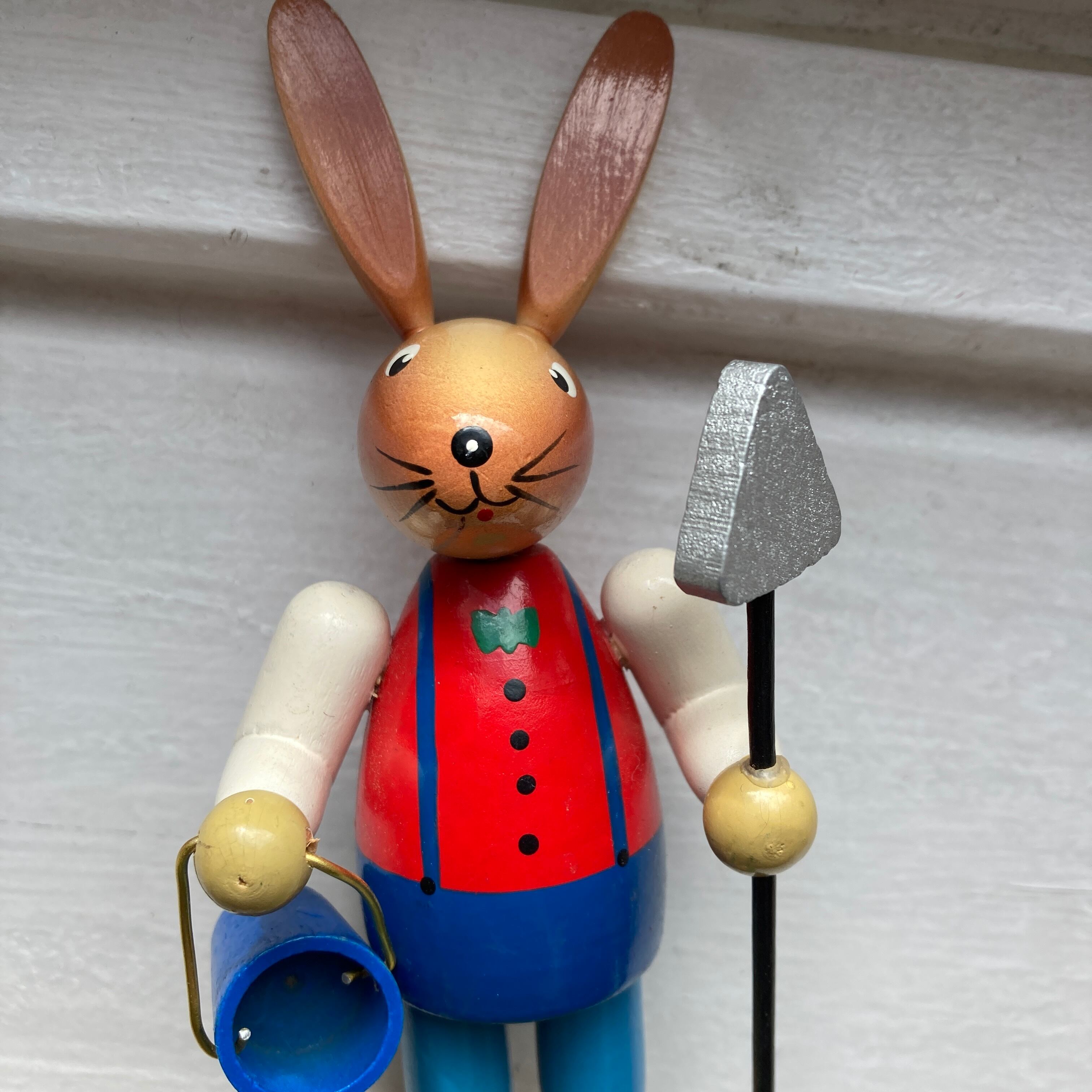 サスペンダー付きズボンをはいたうさぎは、ショベルとバケツを。バケツは、ゆらゆらと動きがあります。