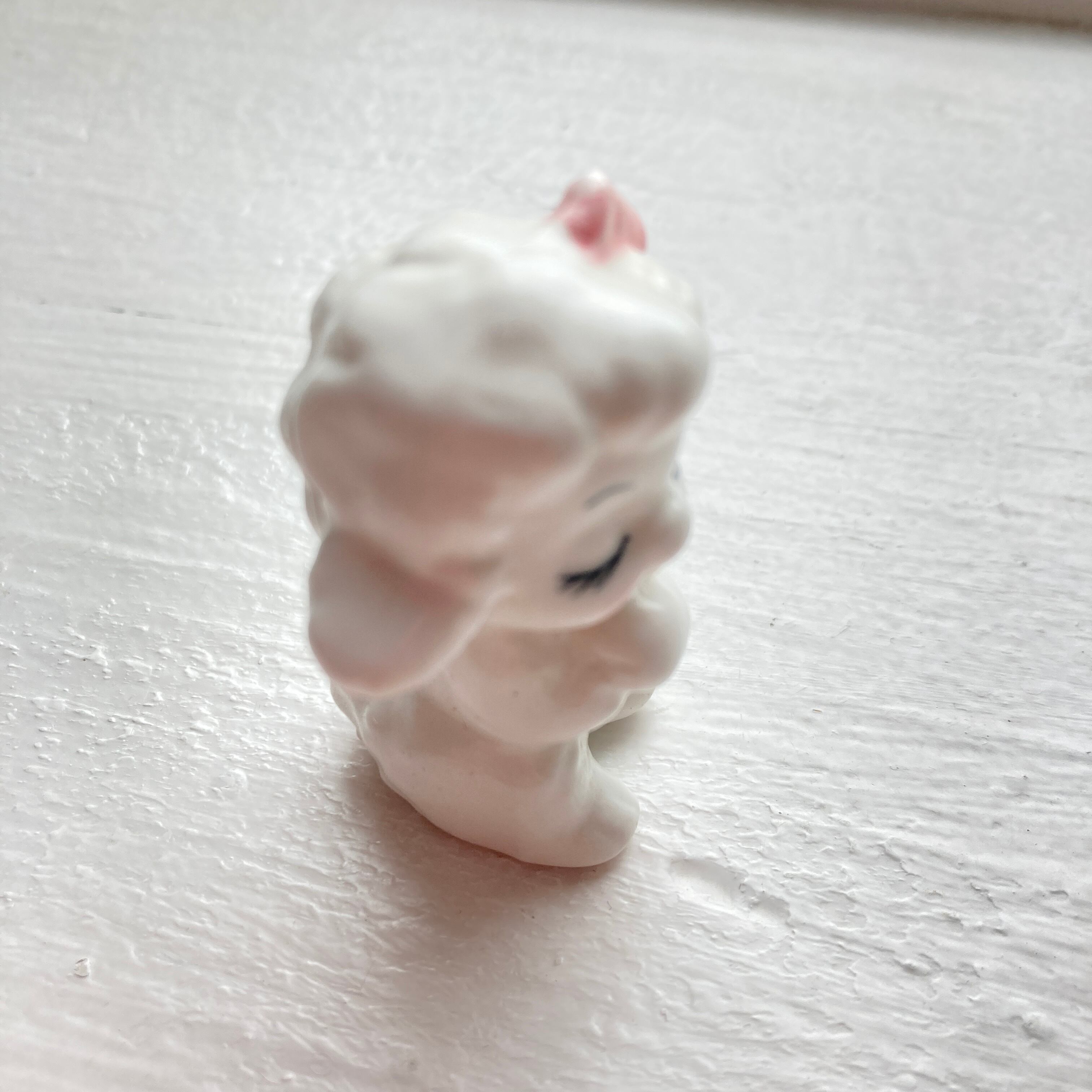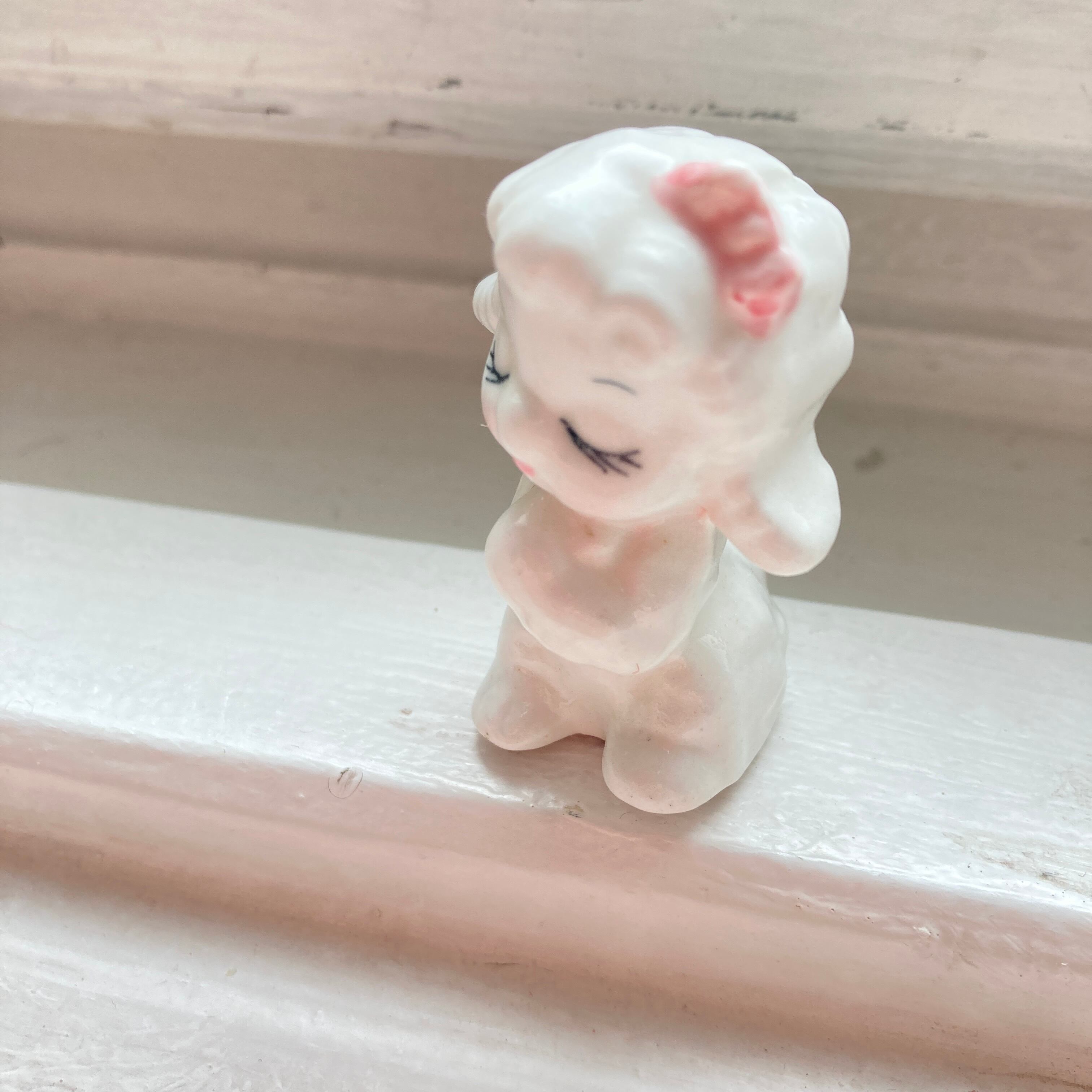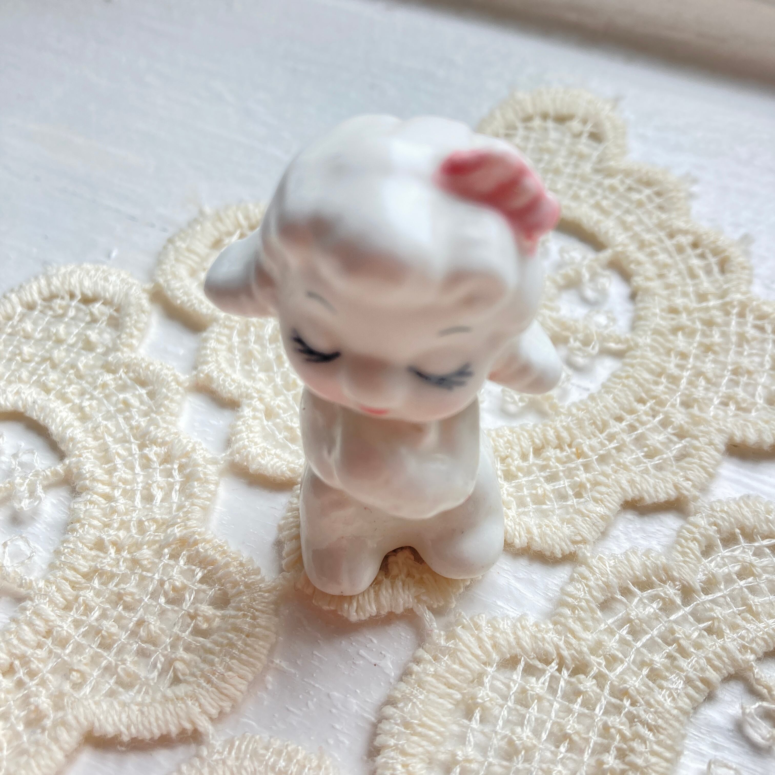 垂れた三角の耳やリボンがかわいい小さな羊の陶器のフィギュアです。