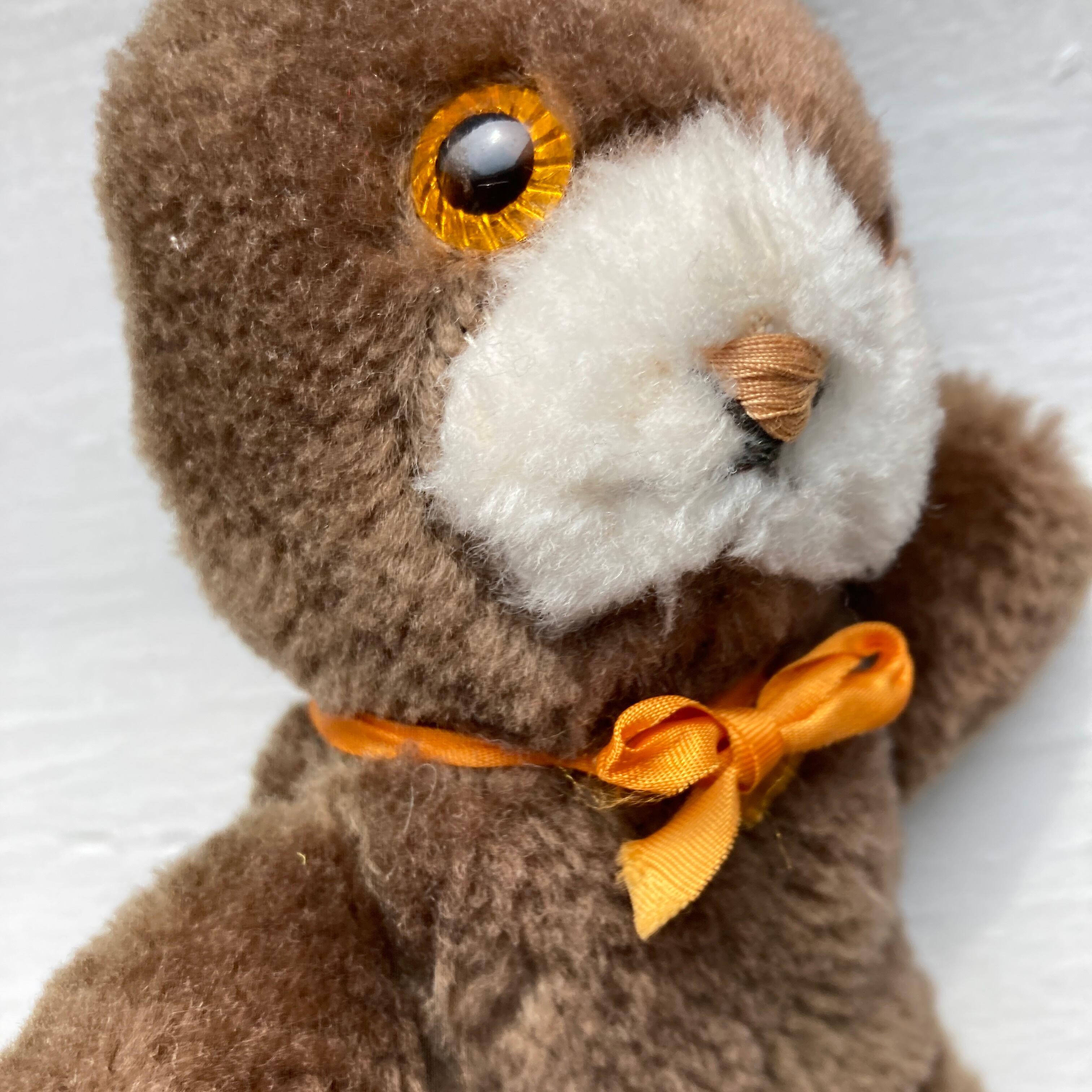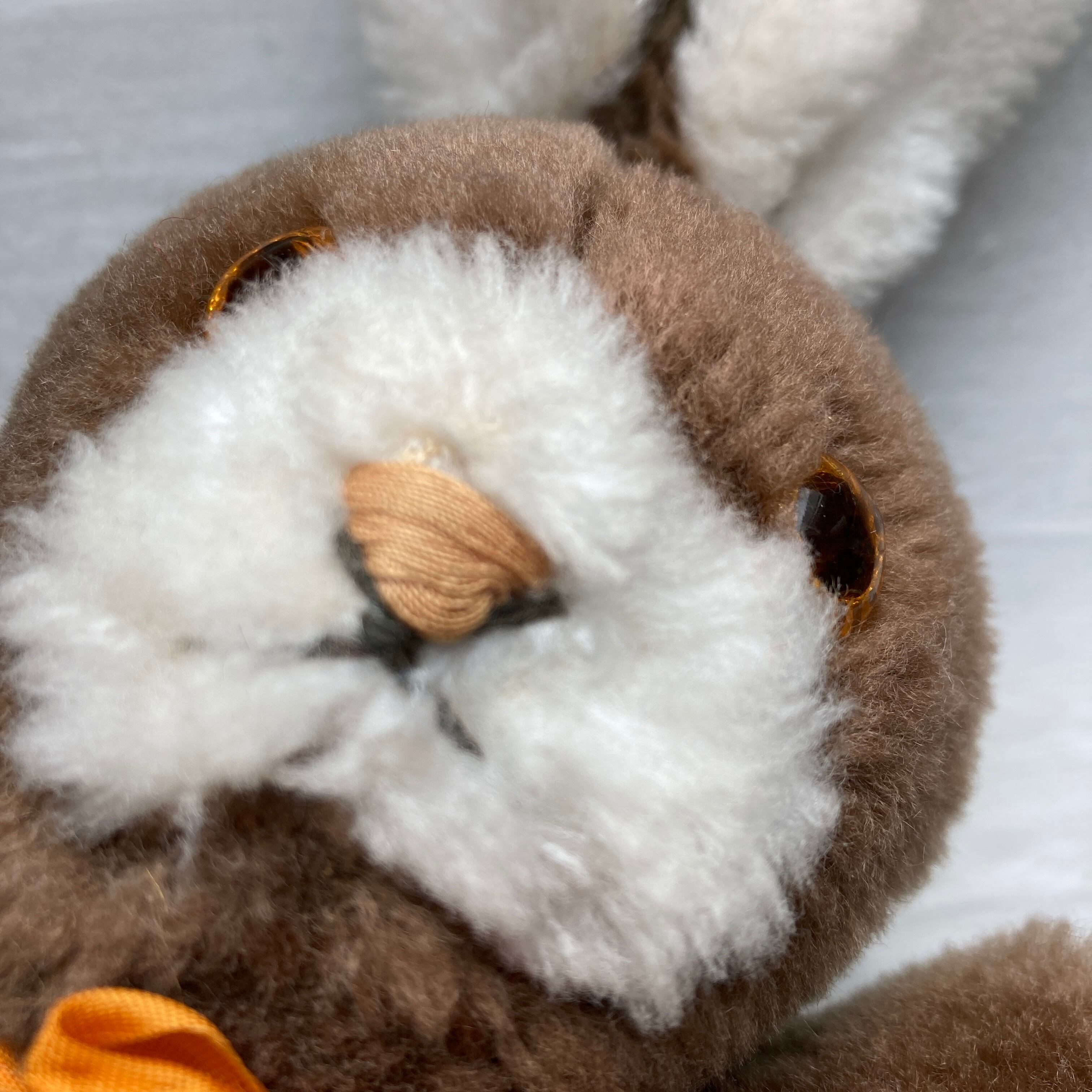 ちょこんと片手をあげた様子がかわいらしいうさぎのぬいぐるみです。