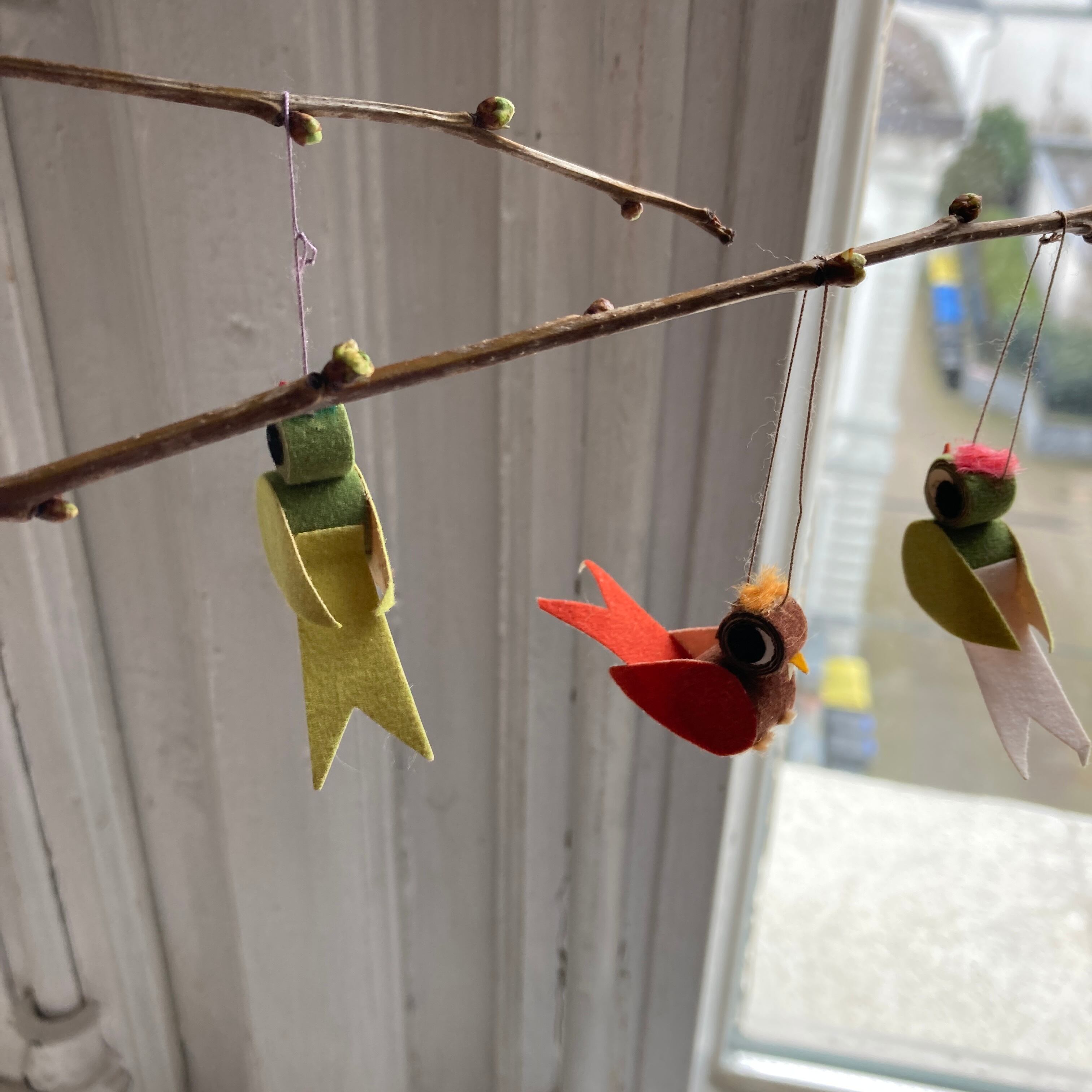 くるくると巻かれた紙で作られており、頭の毛や足を糸の束で表しています。シンプルな作りながらも、木にかけて飾るととても愛らしいです。季節を問わず楽しめるものです。