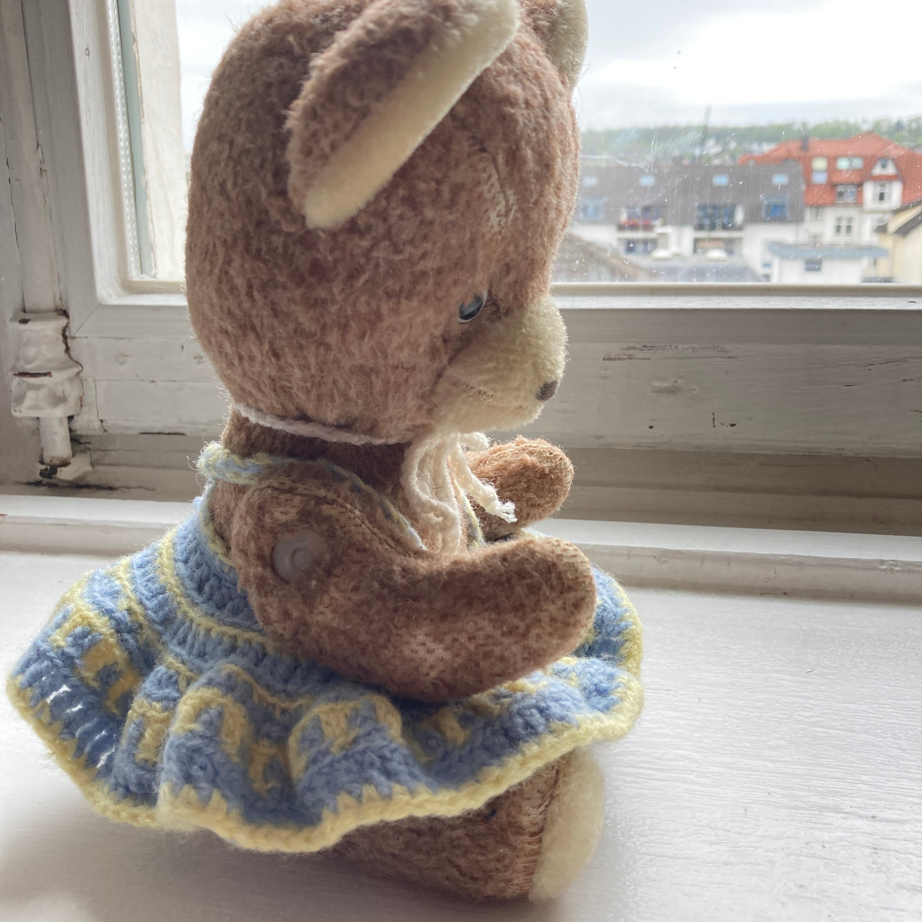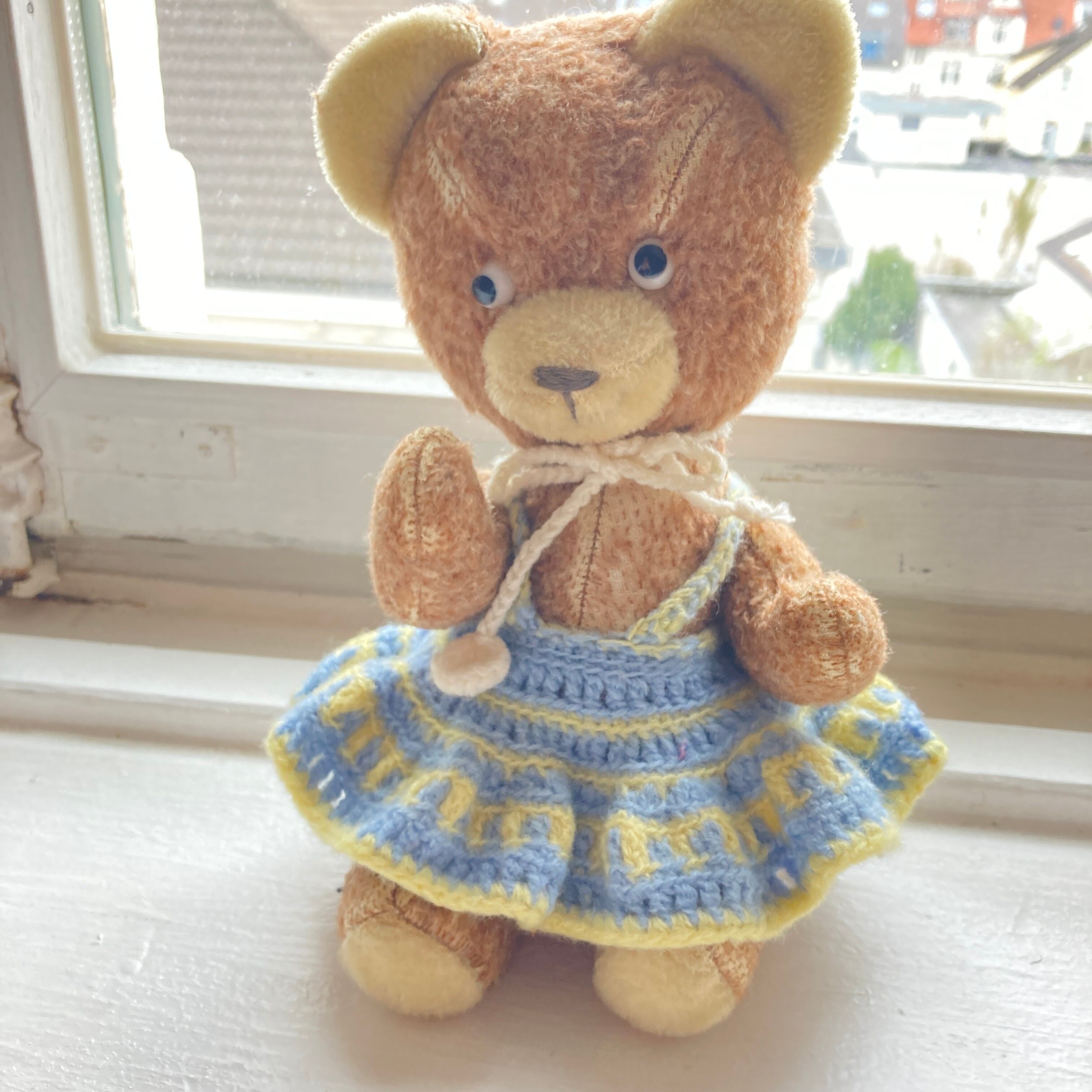 お手製のニットのスカートを履いていて、首のリボンも毛糸で編まれたものです。