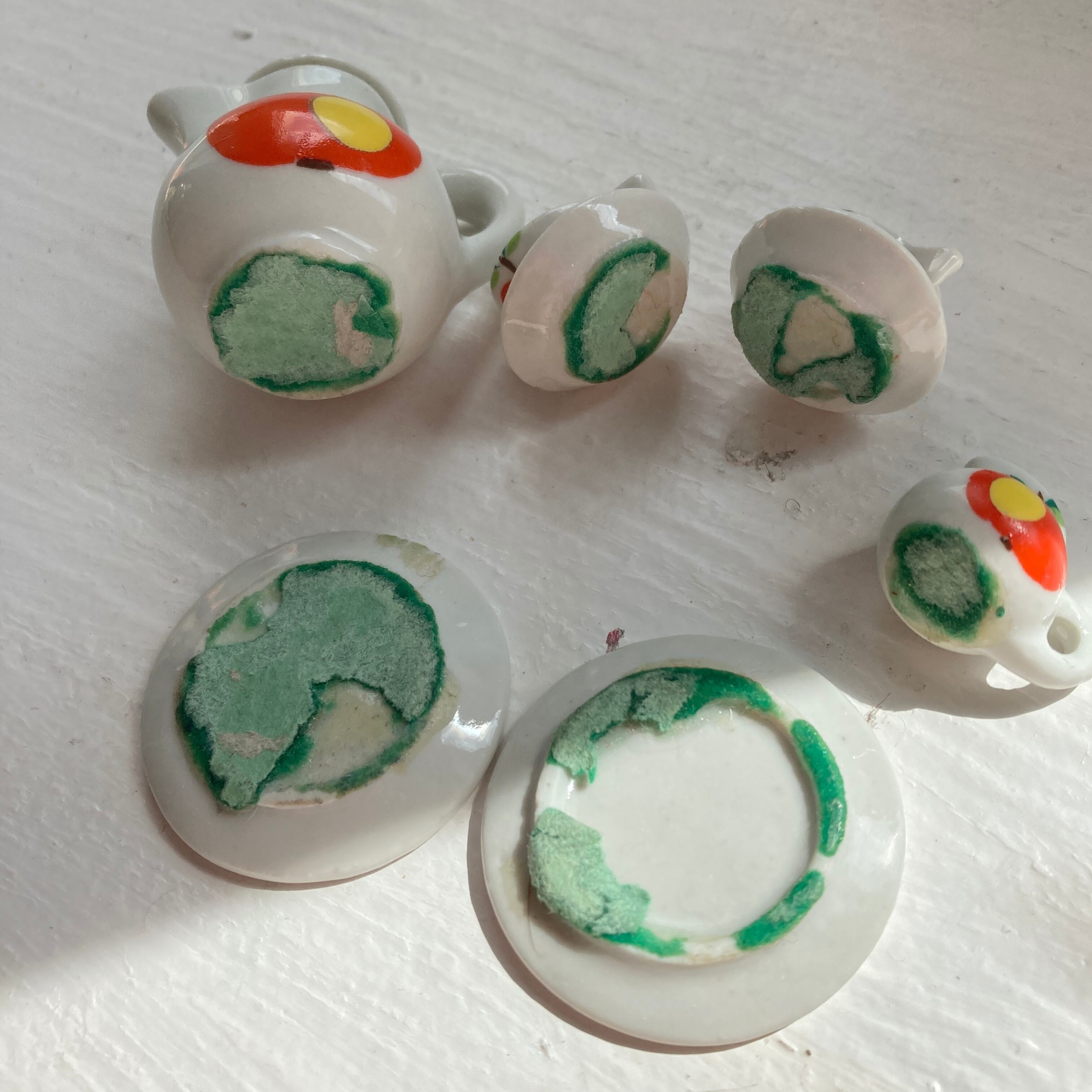 ティーポット、プレート2枚、ティーカップと受け皿が2つ、小さなピッチャーのセットです。ポットの蓋、ティーカップと受け皿が接着剤でつけられていて取れません。