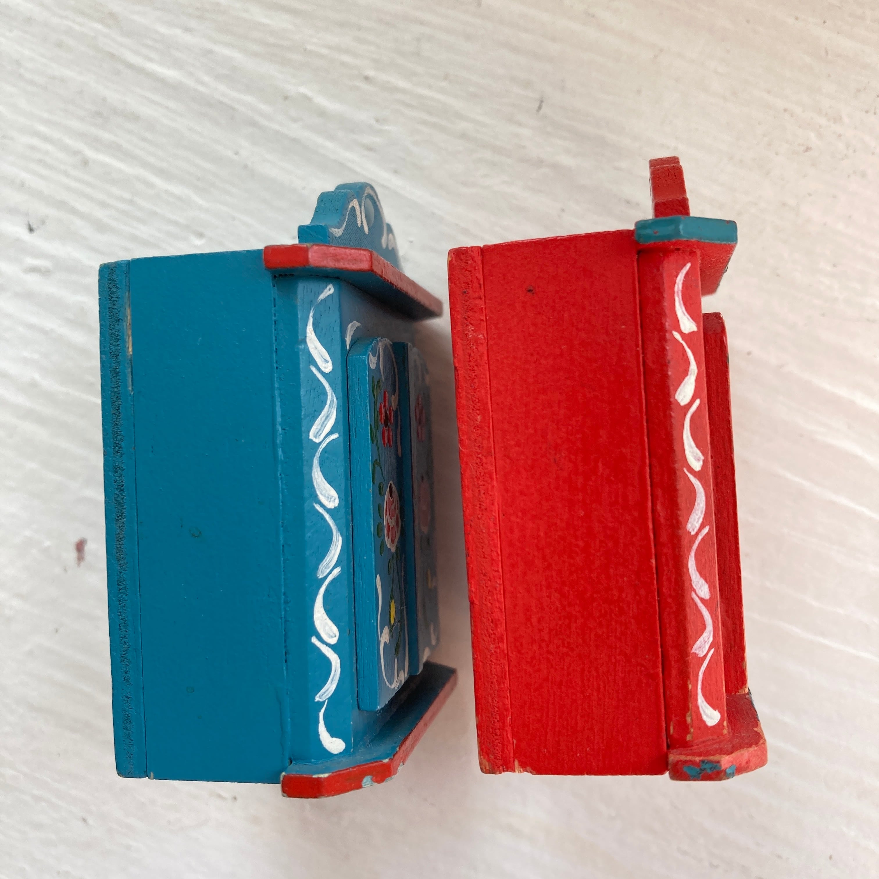 ドールハウス家具と同じく、赤とブルーでペイントされ、トゥルツ地方の薔薇が描かれたマッチケース。中に、市販のマッチケースがぴったりと収まります。