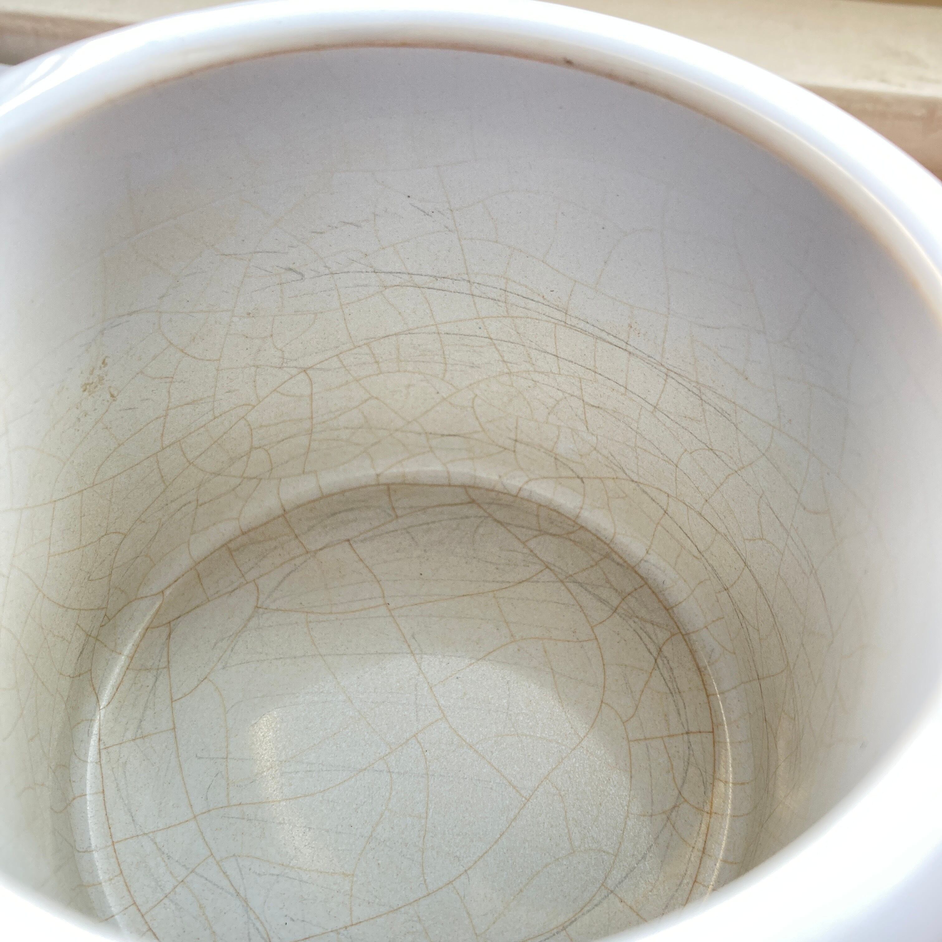 白の釉薬はわずかにぽってりとしていて、イチゴ(赤と緑)の部分が少しへこんでいます。側面にも少し貫入の見られる個所があります(写真7,8)。中は貫入が目立ちます(写真14,15)。