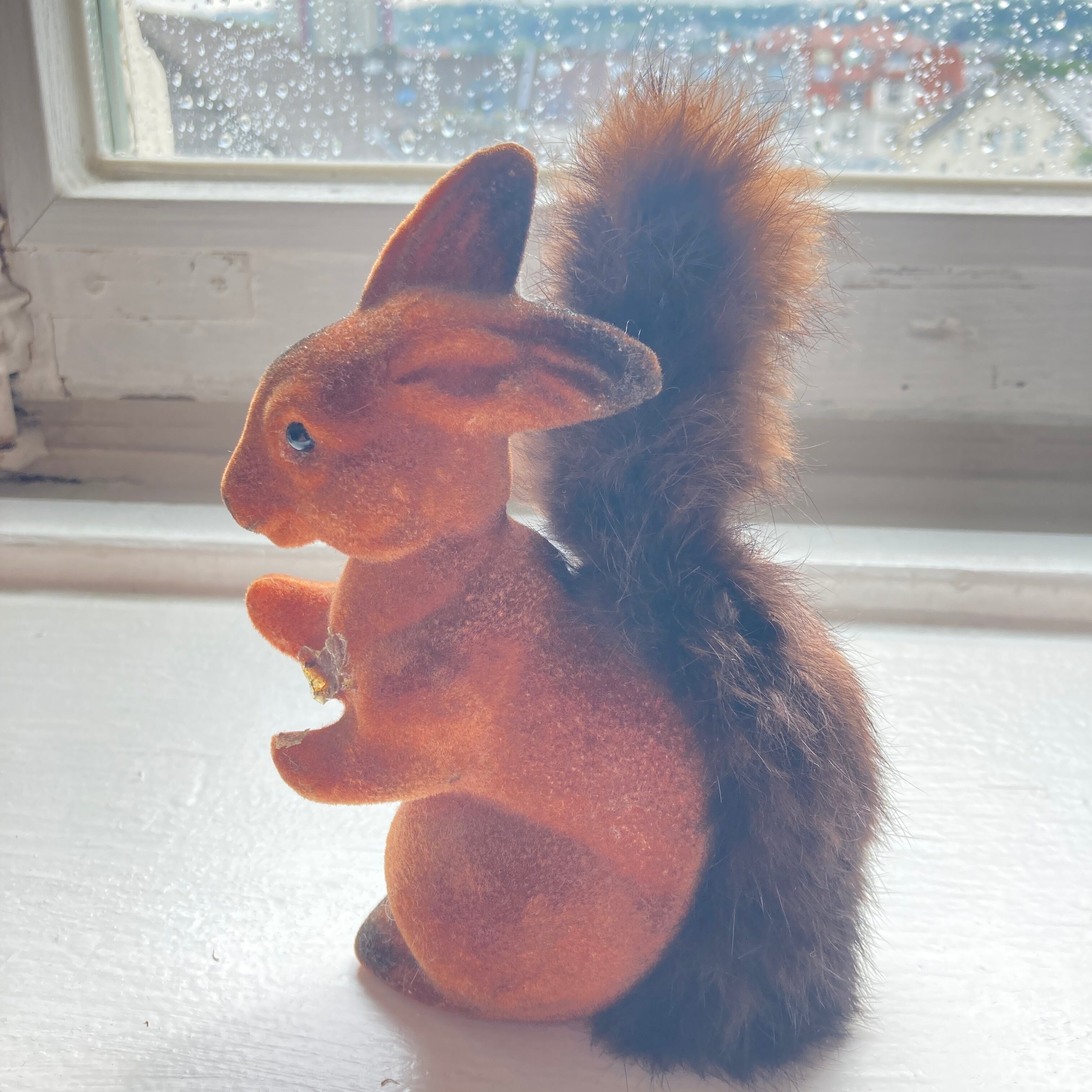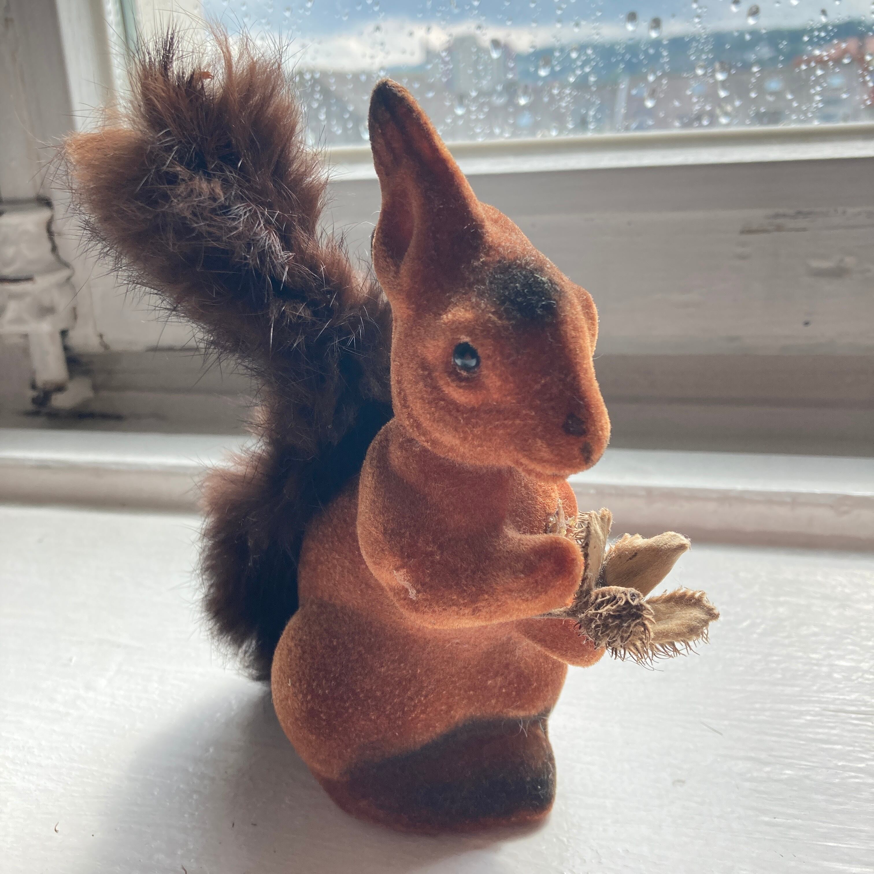 状態など:持っていたどんぐりか何かの木の実がなくなっており、接着剤だけ残っています。写真では実を置いたりしています。目の周り、耳の先や手の先など、フロッキー素材が若干薄くなっている箇所があります。右腕に白っぽい接着剤のようなものの跡があります(写真11)。