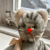 頭は木毛、ボディは頭よりも柔らかいですが、しっかりとしていて中身が綿ではないようです。目と鼻はプラスチック製、口は刺繍です。ヒゲは曲がっています。毛はアクリル製と思われます。