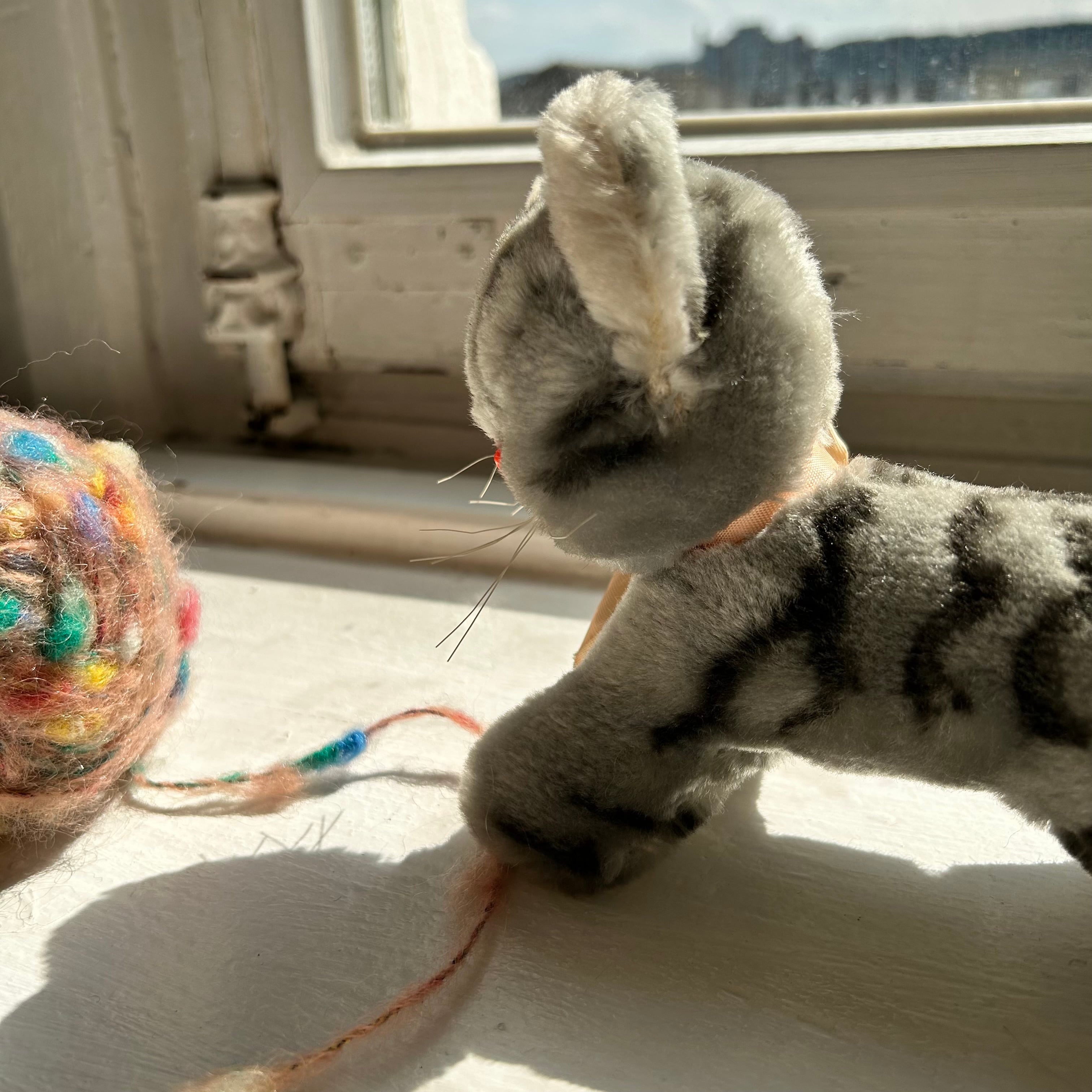 グレー地に黒いトラのような模様が入ったねこのぬいぐるみです。