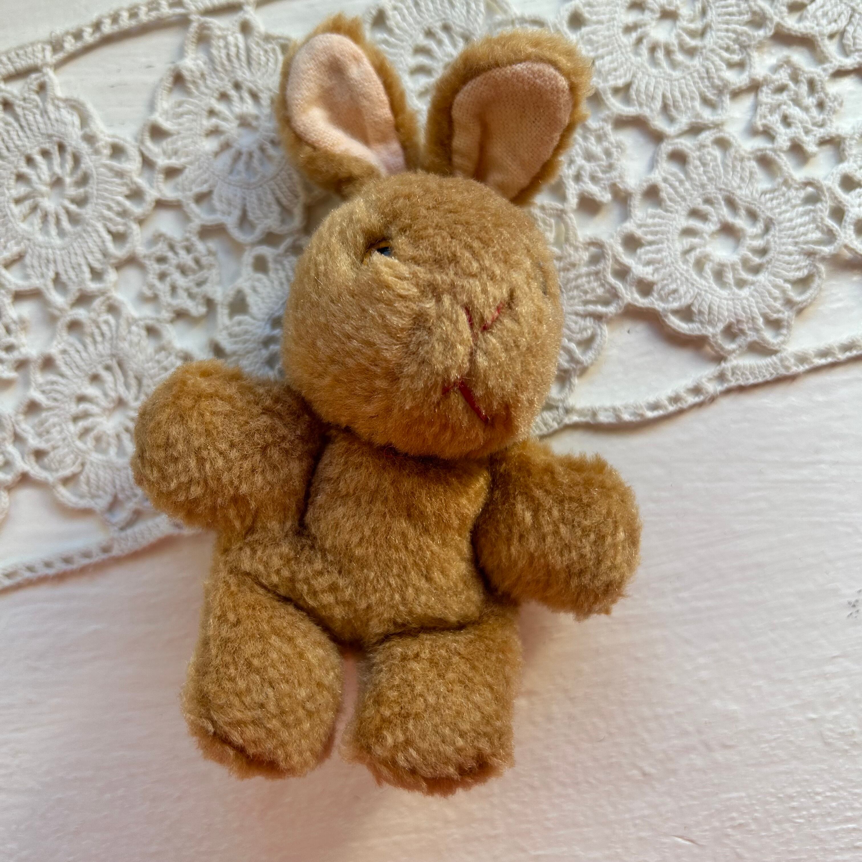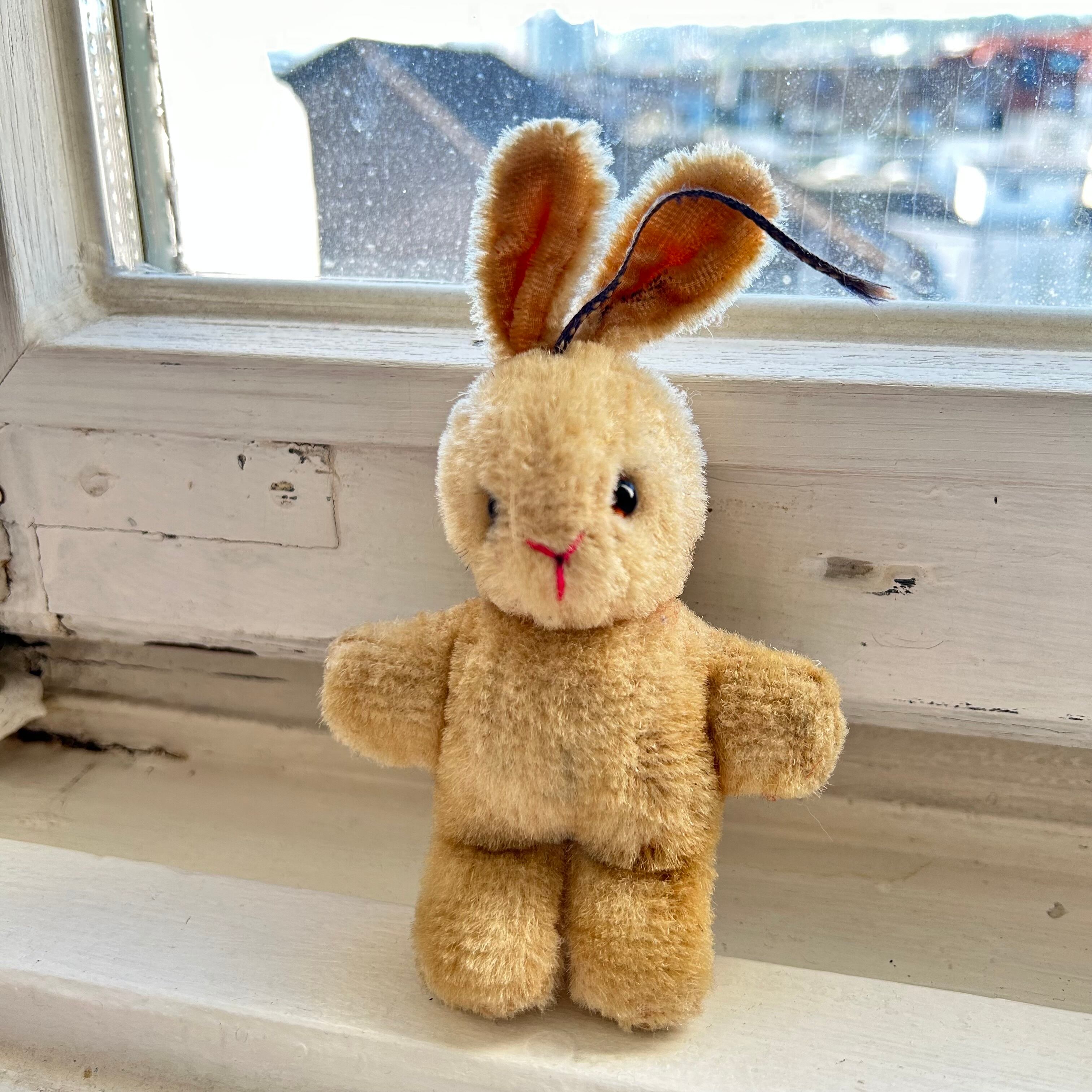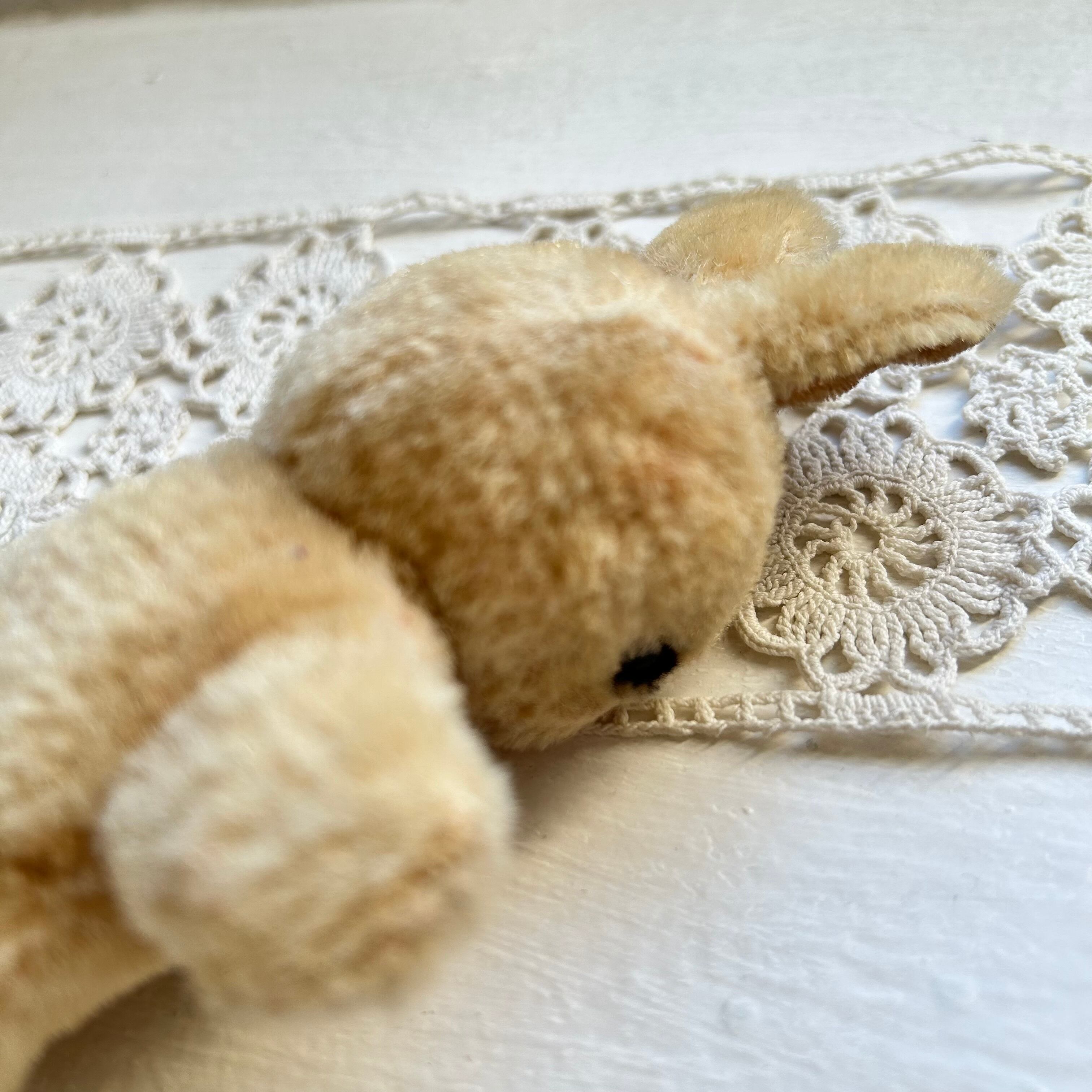 ベージュのうさぎ(写真2~10)は、短い手足に長く細い耳がかわいい、モヘア毛、グラスアイのちいさなぬいぐるみです。頭もボディにも木毛がしっかり詰められていると思われ、硬さがあります。頭から出ている黒いリボンは切れています。経年によるうっすらとした汚れがあります。左耳の中にペンで書いたような汚れや足先に毛の抜けがあります。