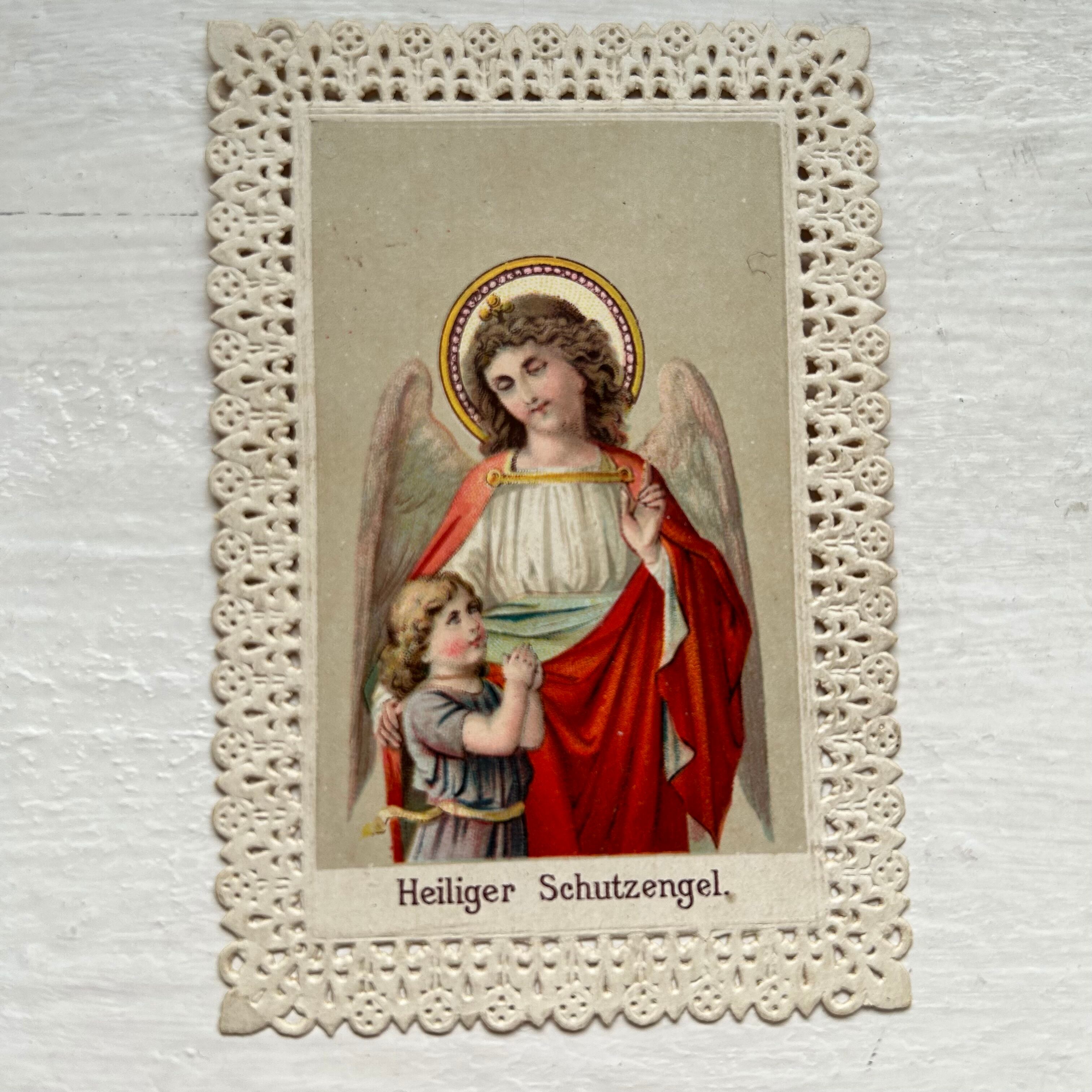 聖なる守護天使と書かれた、淵のトリミングがきれいなもの。このトリミング、よく見るとお花が並んでいるようにも見えます。