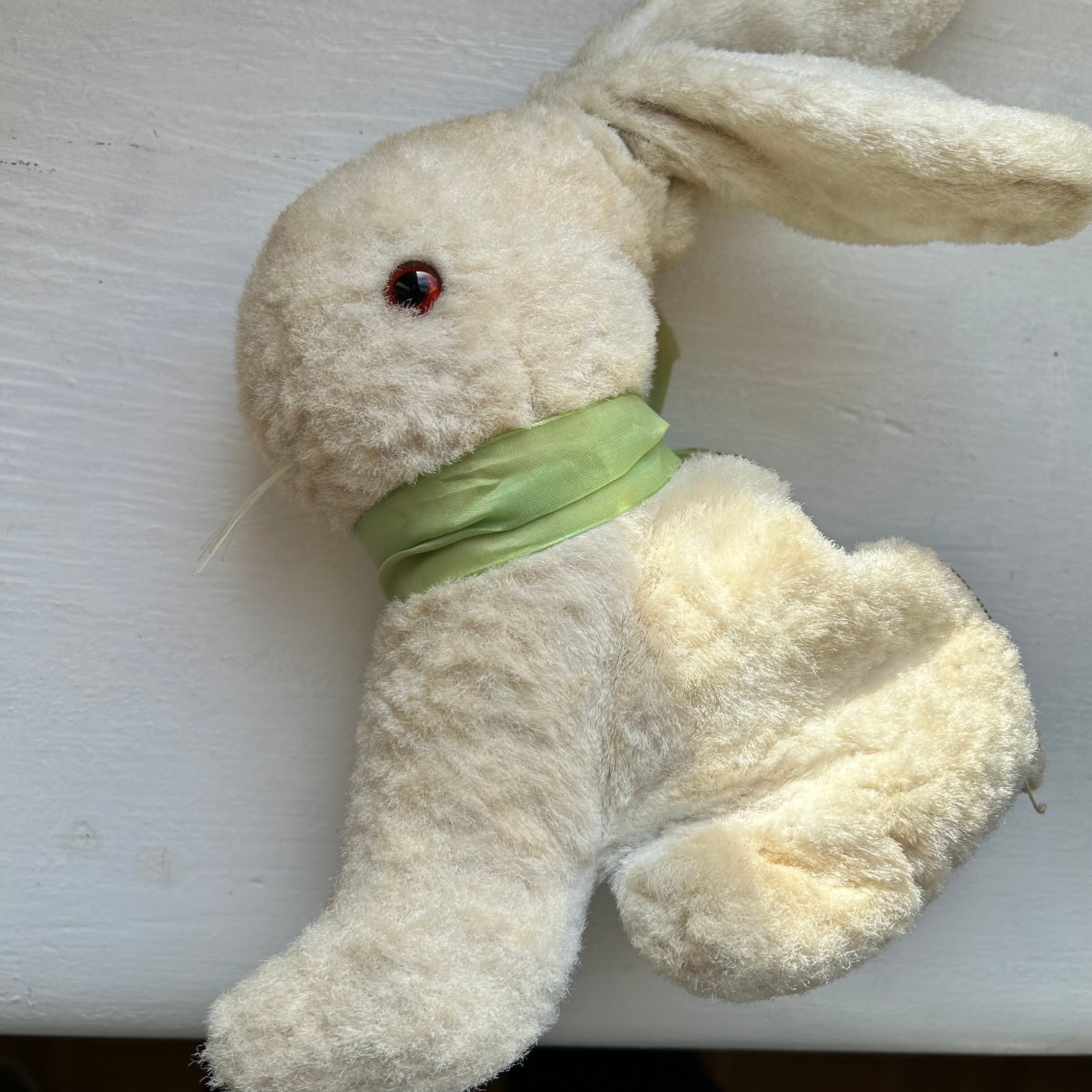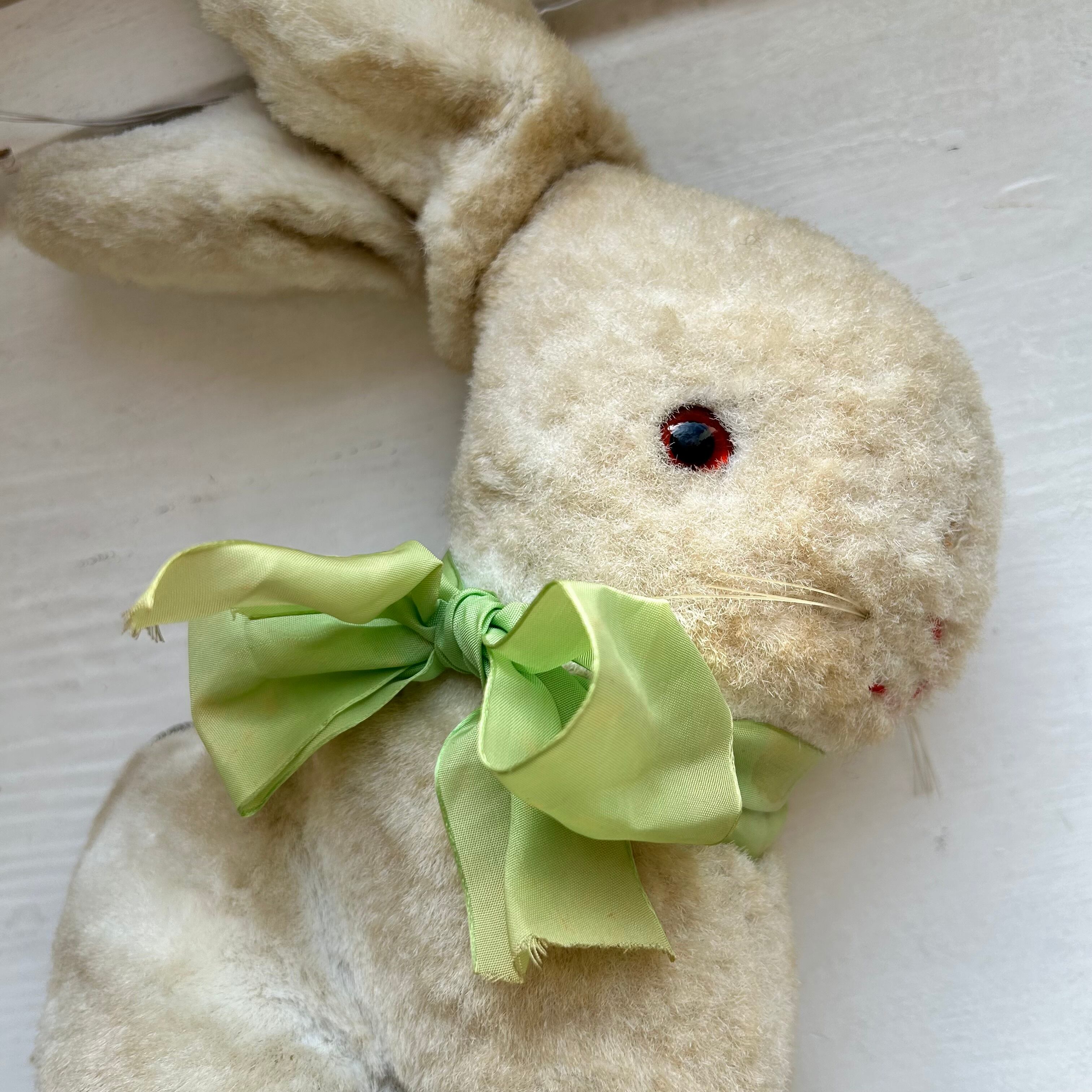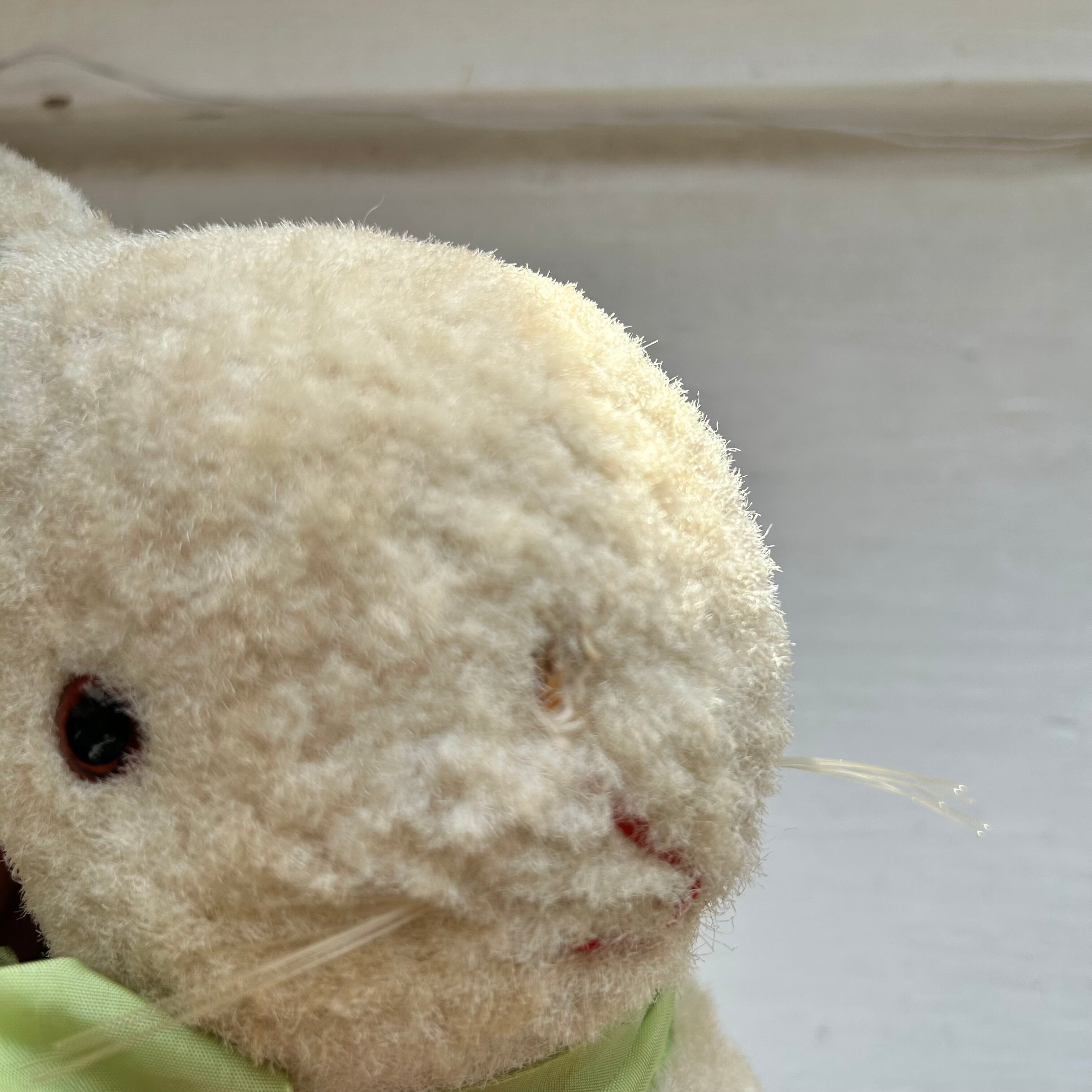 状態など:きれいな白が残っている耳の付け根やリボンの下と比べるとうっすらとした汚れが付いています。右側の鼻上に小さな穴があり、中の木毛が見えています(写真13,14)