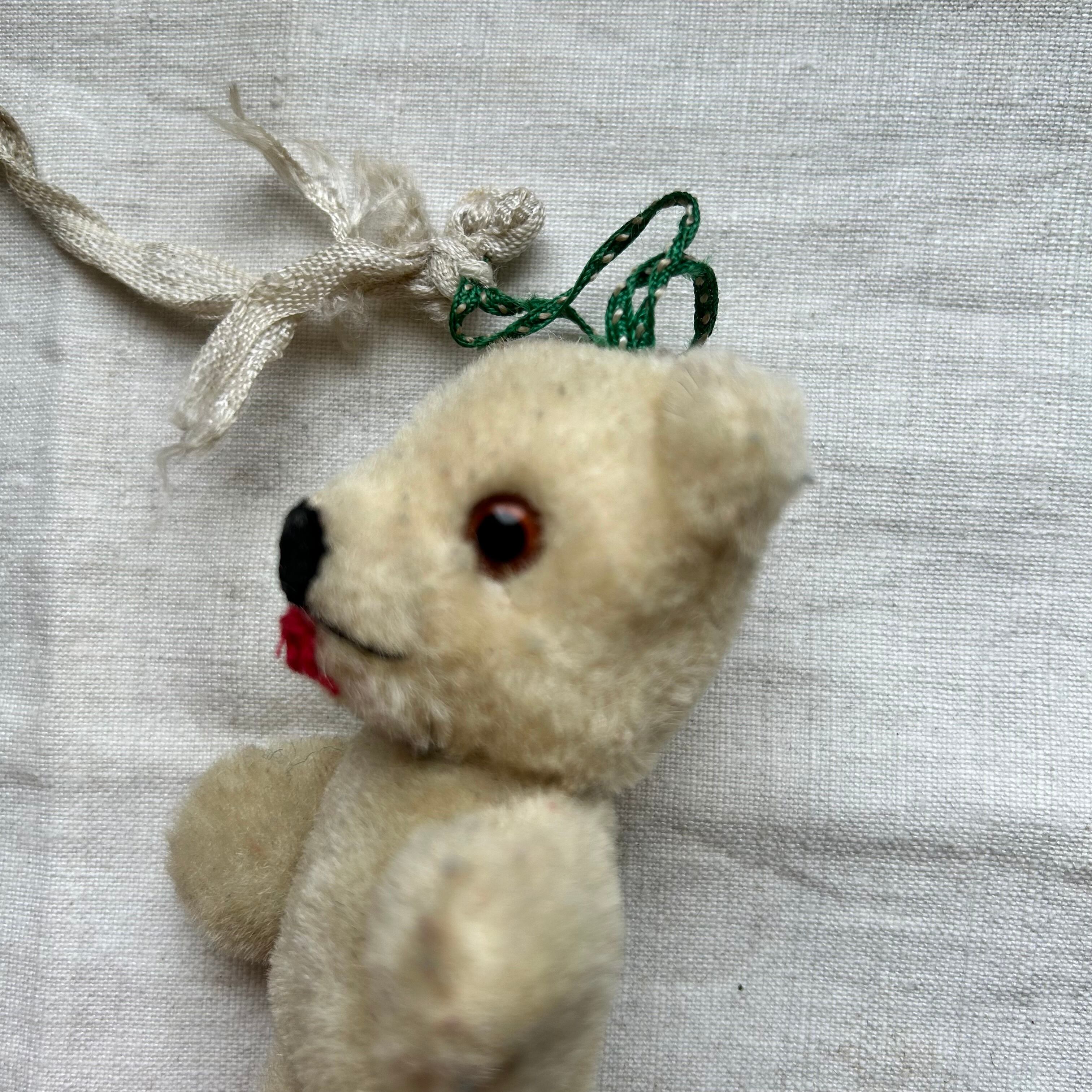 ぺろっと出した赤い舌、モヘア毛、グラスアイのちいさなぬいぐるみです。頭もボディにも木毛がしっかり詰められていると思われ、硬さがあります。