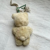 状態など:背中の左側に赤い汚れがあります(写真7)。白い毛の中にところどころ黒い毛が混じっています。頭から緑のリボンが出ています。また、そこに付けられた紐もそのままにしてあります。白なので、薄汚れた感があります。舌となっている赤い布がほつれています。