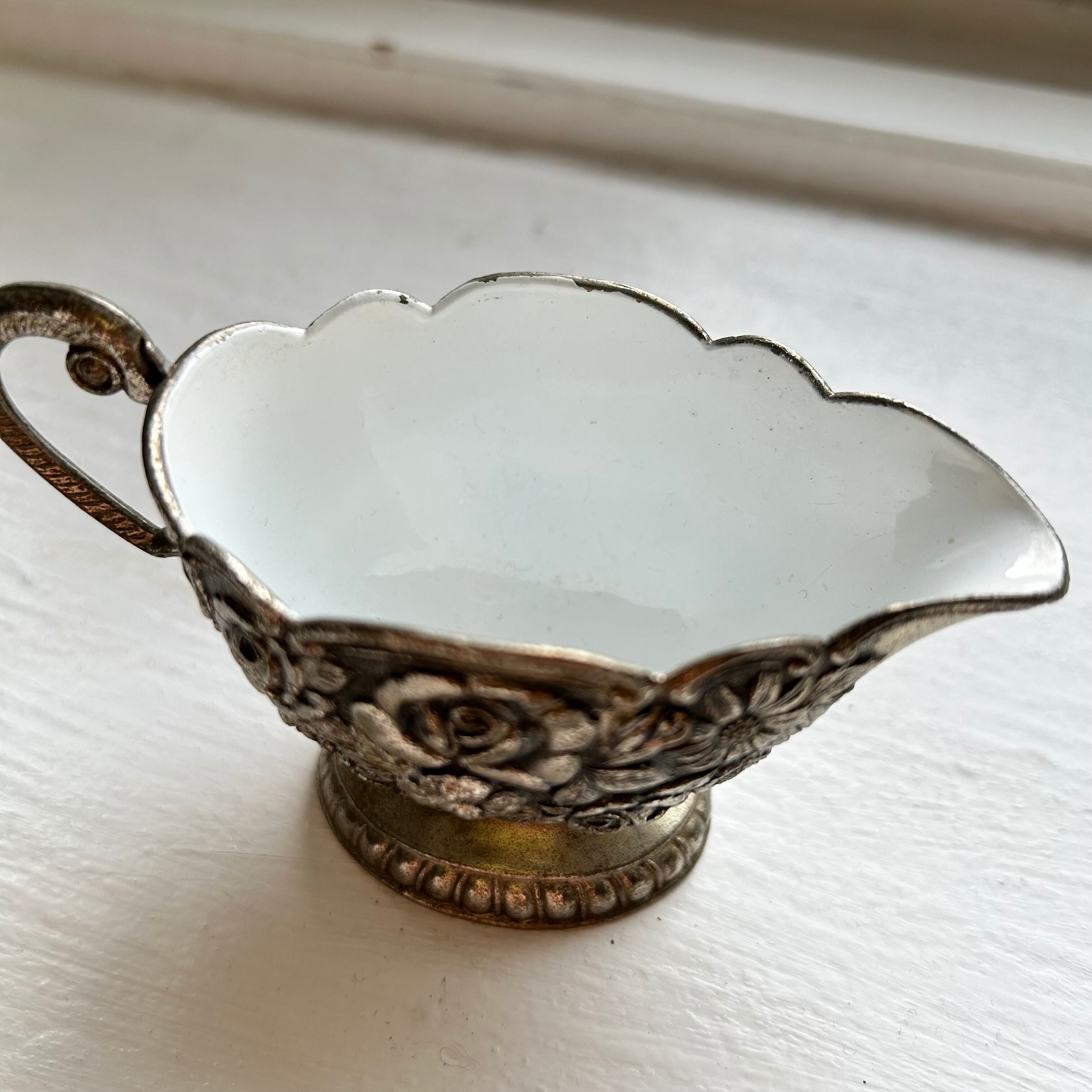 細かく、バラや百合、マーガレットなどの花が彫られた美しいピッチャー。花びらにはしっかりとおうとつがあり、凝った作りです。持ち手や注ぎ口も優美なフォルムです。
