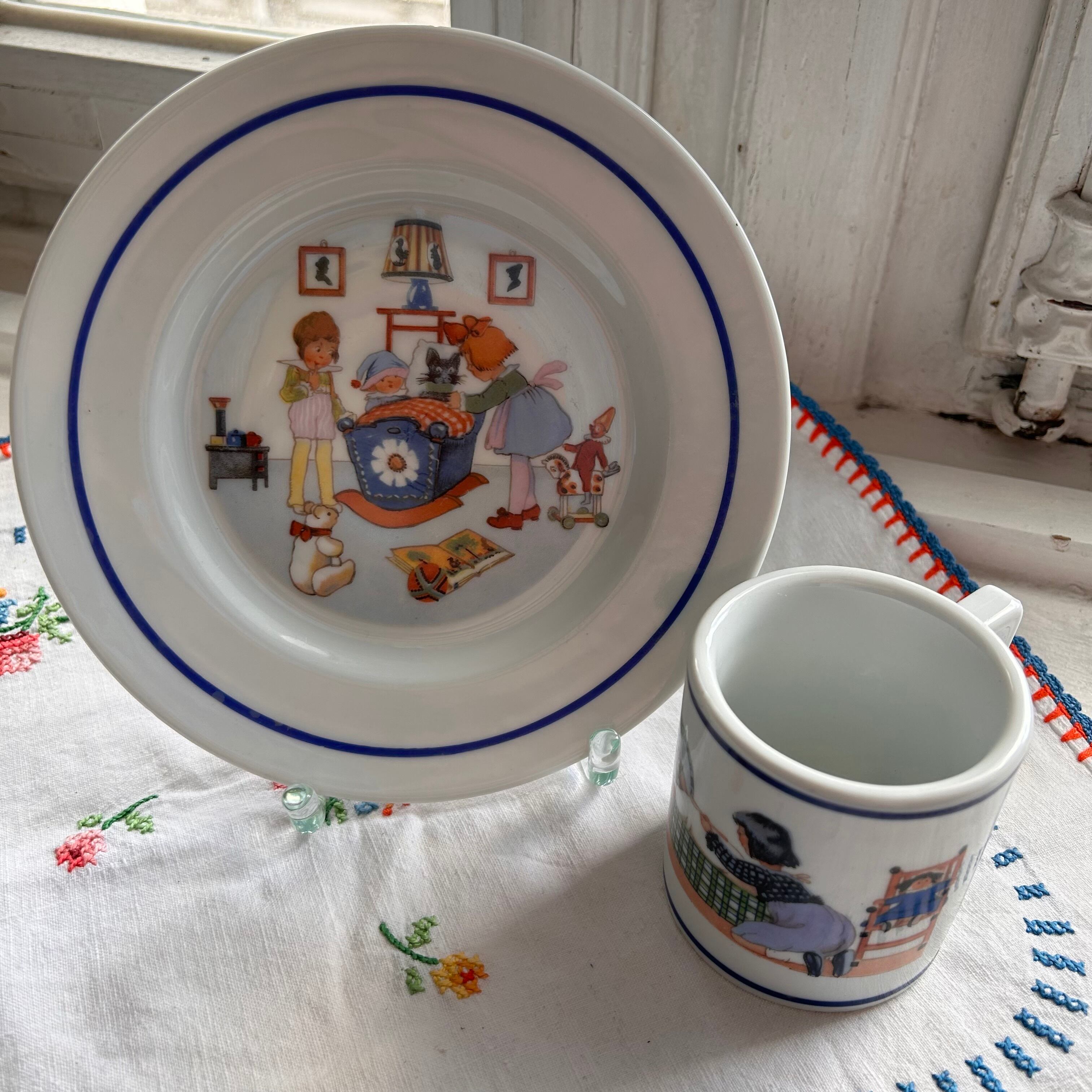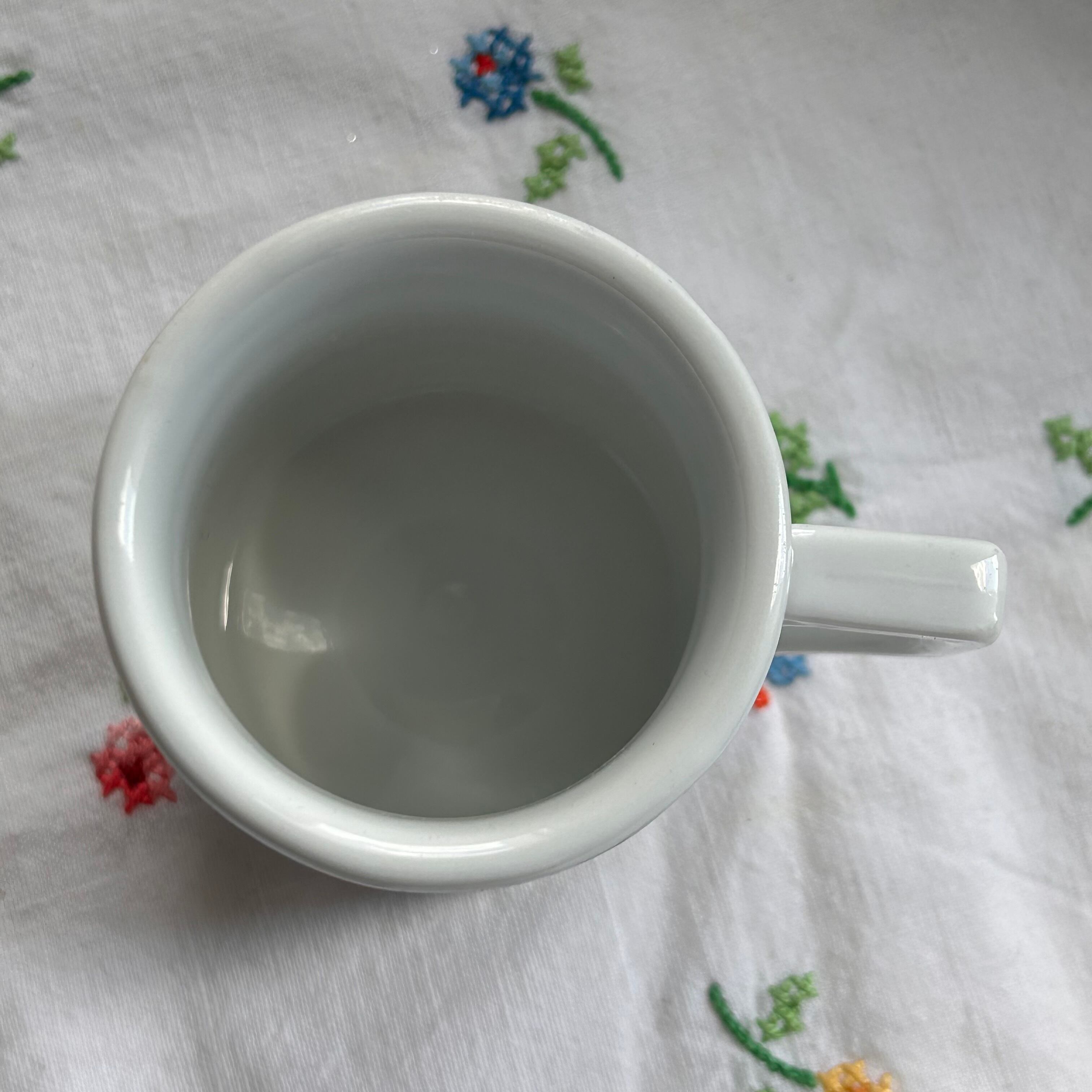 ケガをしたのか包帯を巻いたクマちゃん、ベッドで寝かしつけられる犬などのイラストがかわいいマグカップ。絵本の1ページのようなイラストですね。