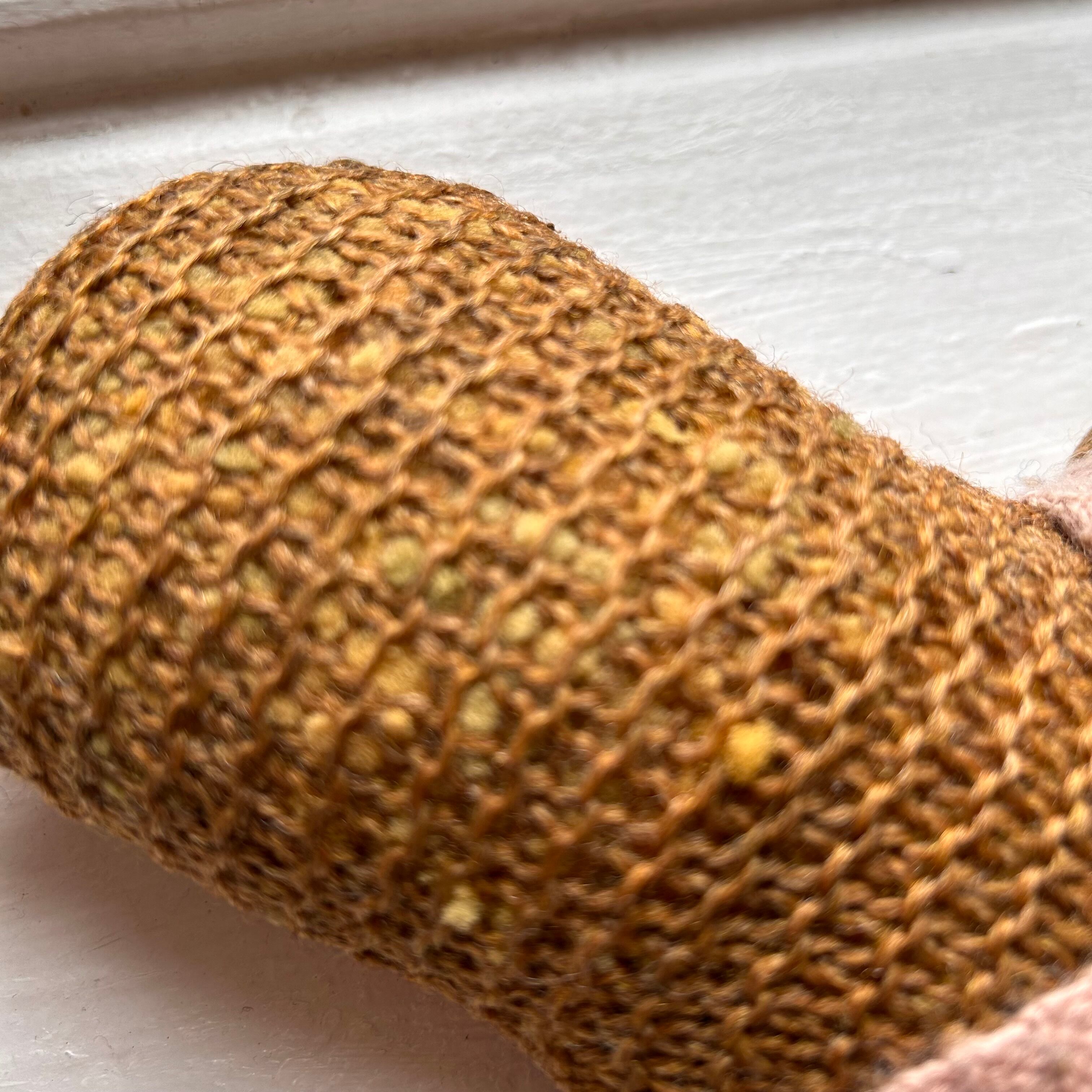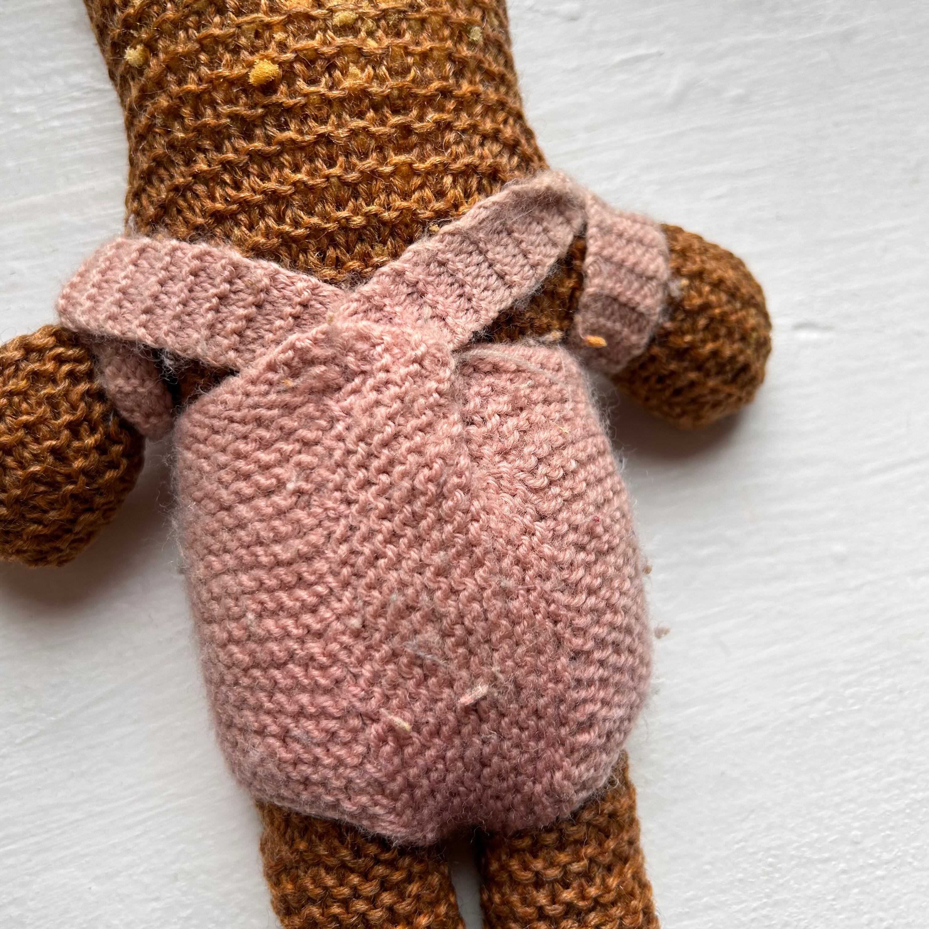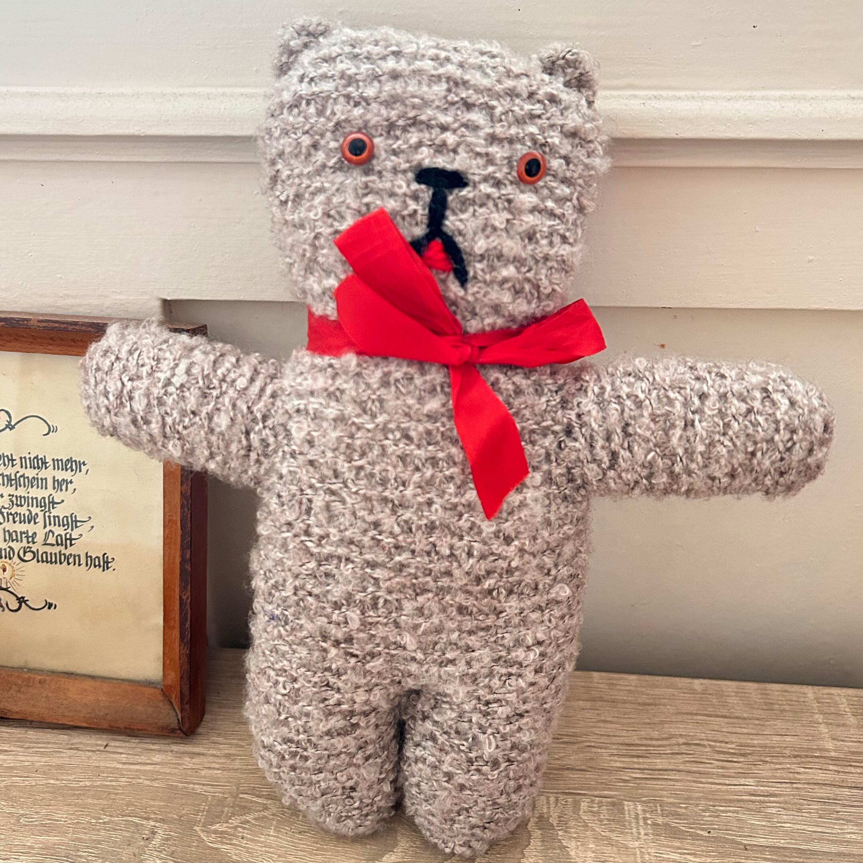 編みぐるみのくまは、ピンクのニットを着ています。細長い手足で、置くと足のところで折れ曲がります。イギリスから来た古い子です。中はスポンジのようで、ところどころ中身が見えたり飛び出したりしている箇所があります。ニットの服に毛玉がありあます。写真でご確認ください。