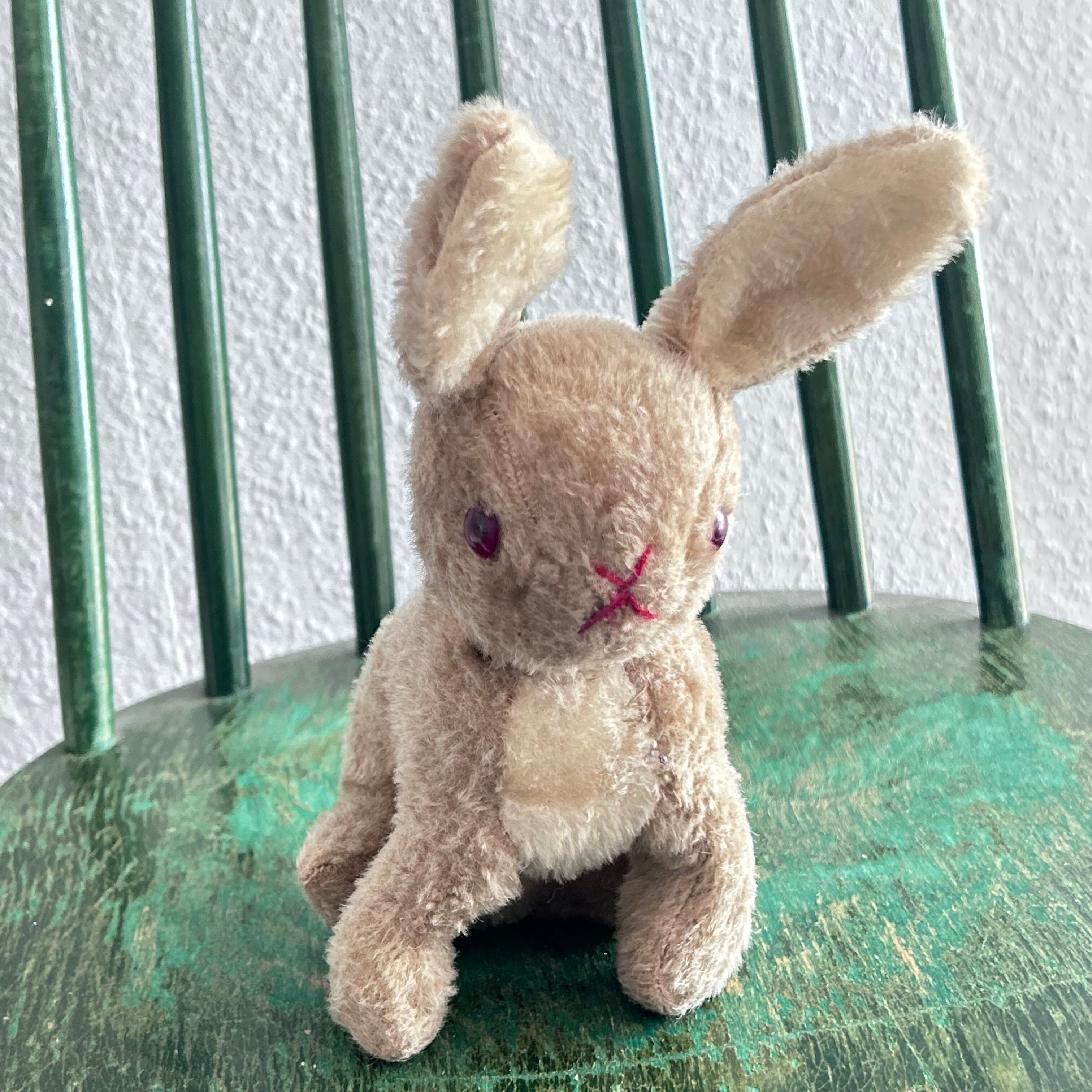 大きな耳とバッテンの赤い口がかわいいうさぎのぬいぐるみです。