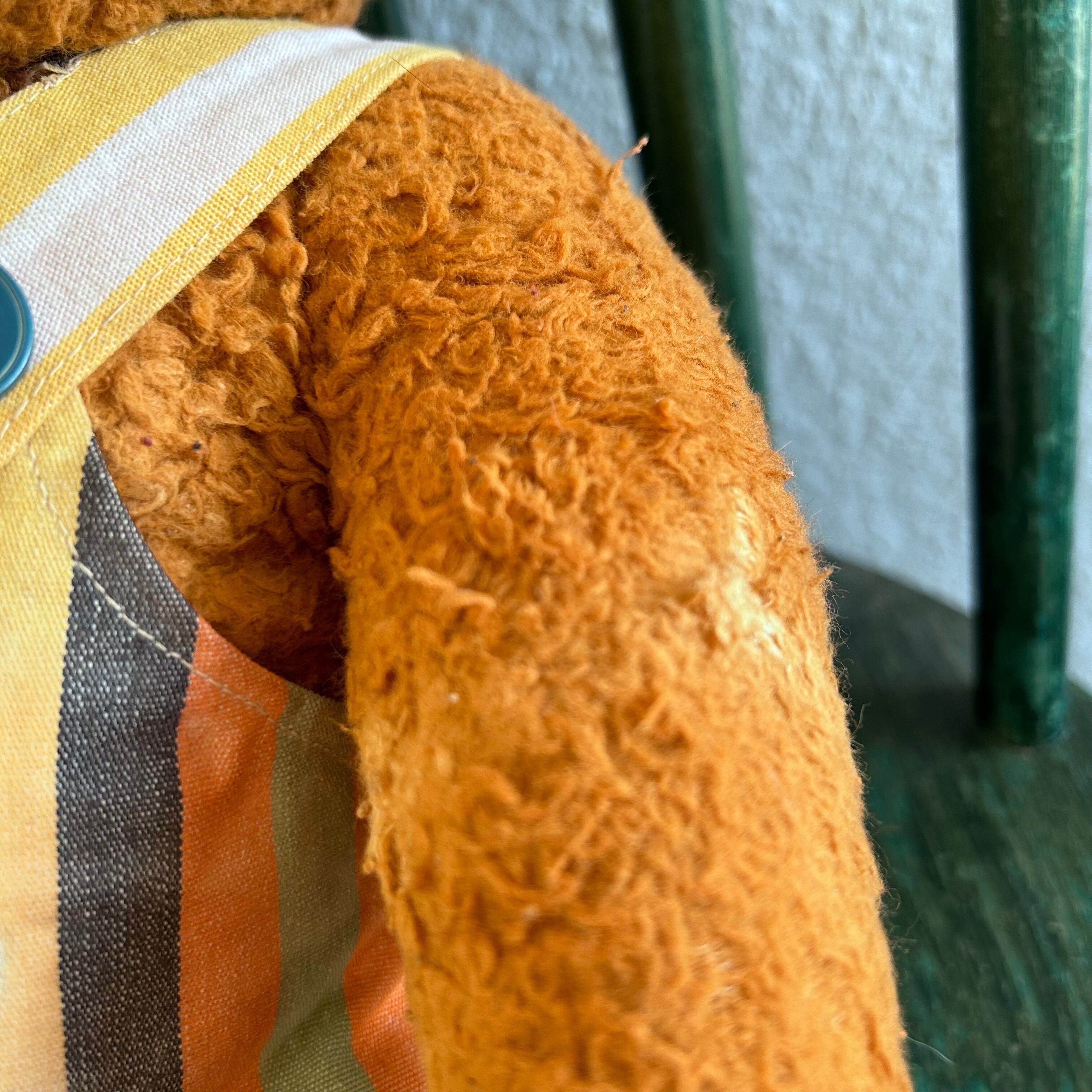 お手製のオーバーオールを着たテディベアです。