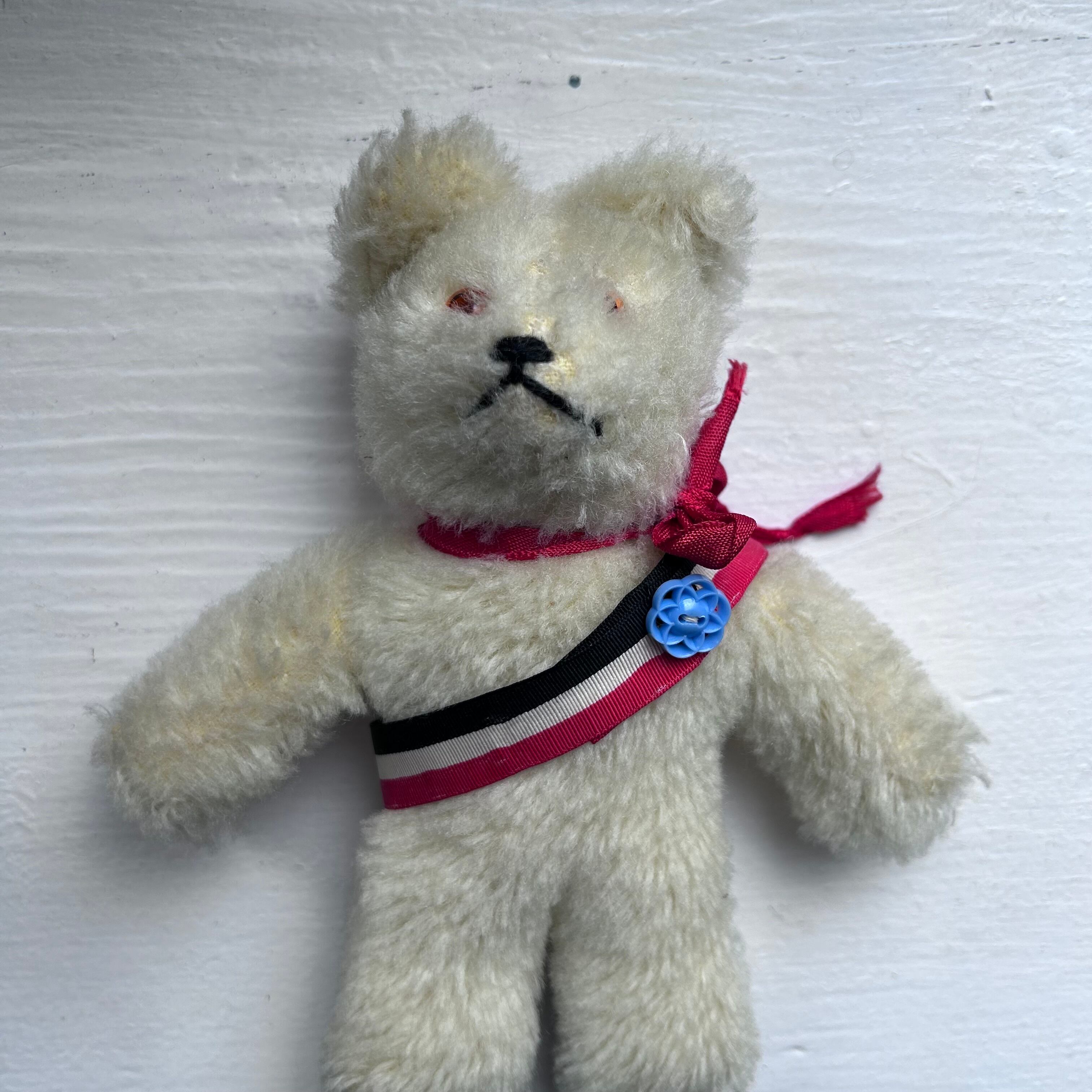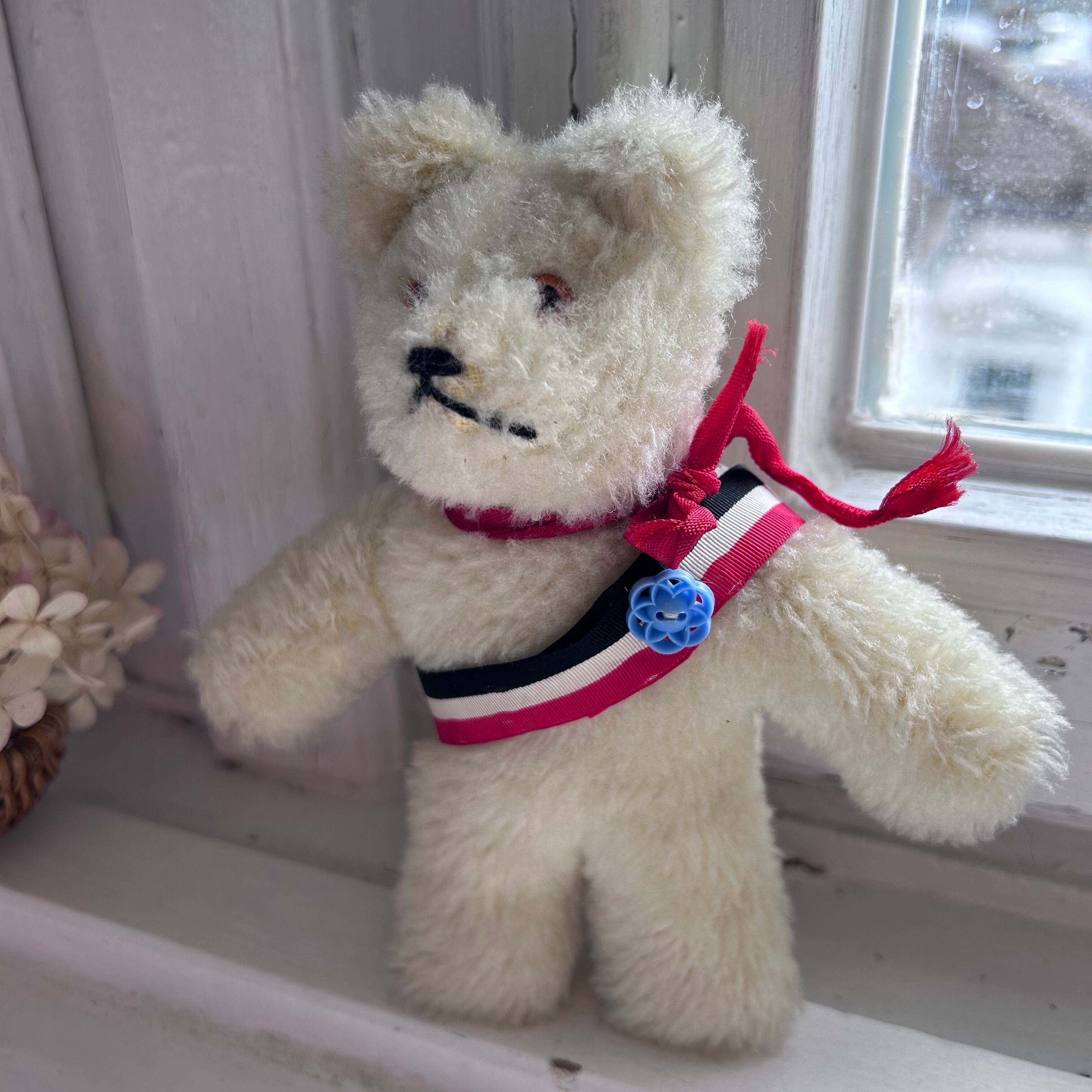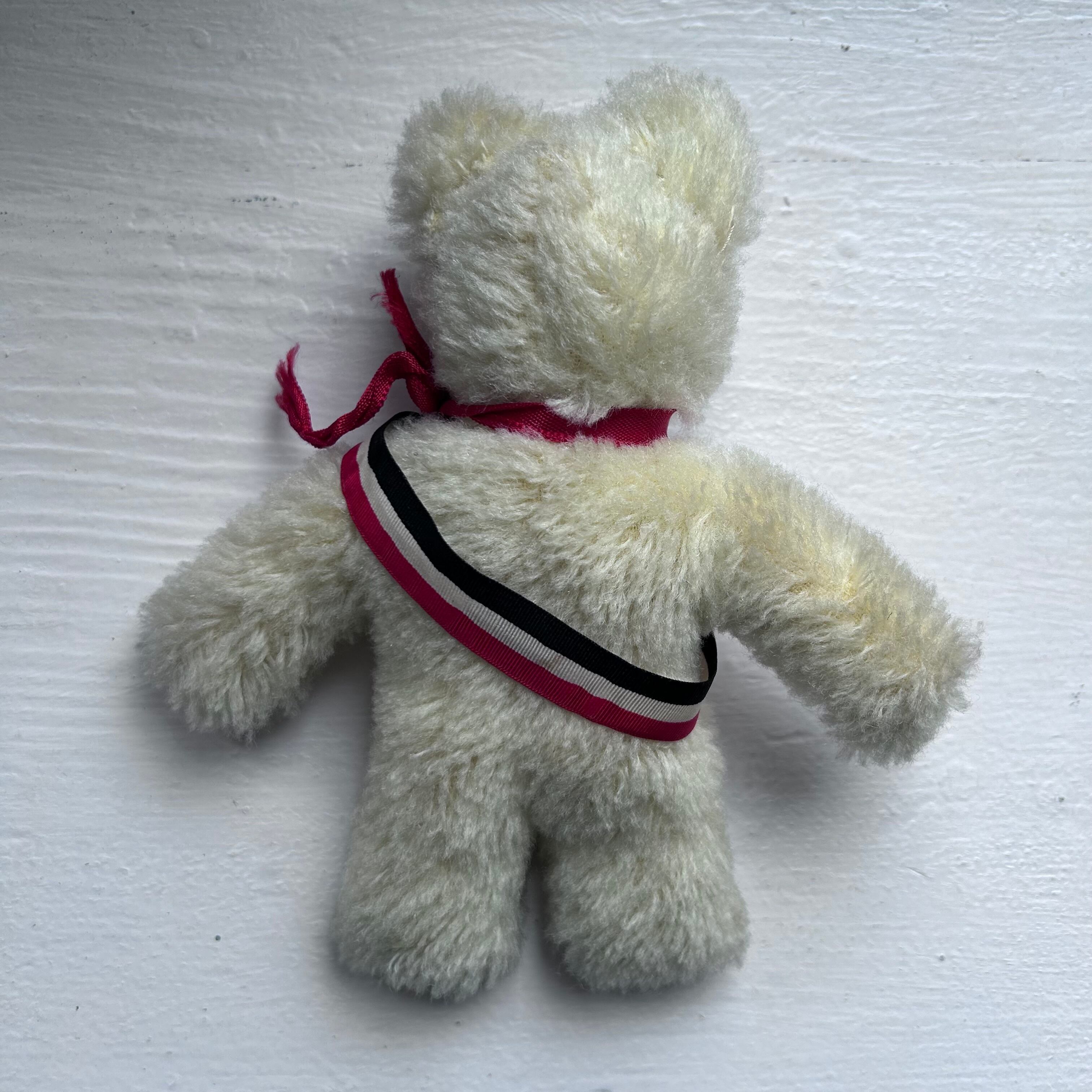 白い小さなベアは、凛々しいお顔で、ベルリンベアのたすきをかけていそうな雰囲気があります。そこで、店主は1867年から使用されていた北ドイツ連邦及びドイツ帝国、初期ナチス・ドイツの国旗(赤、白、黒)の勲章などに使用されていたテープをたすきに見立て着用させてみました。(着脱可能です)