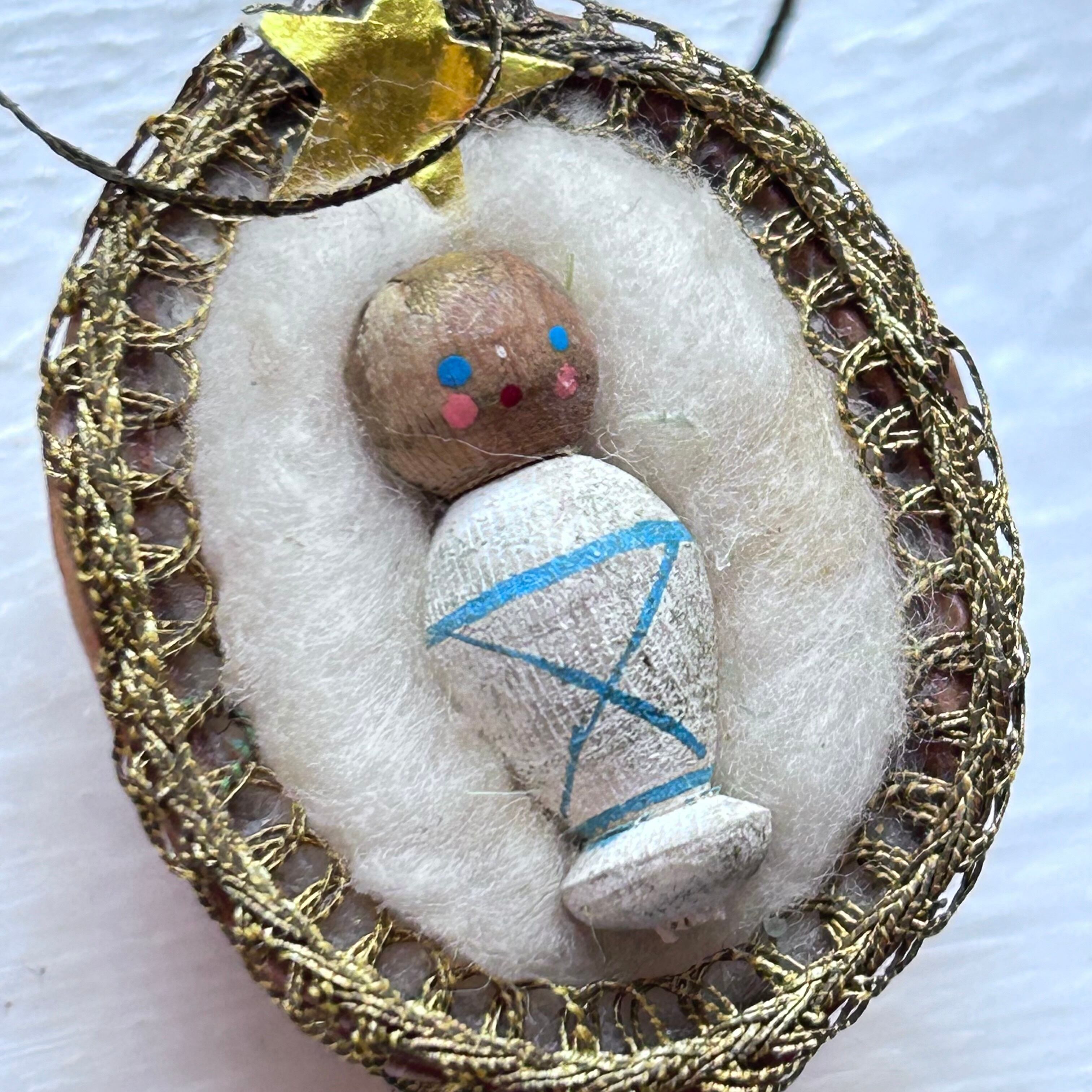 くるみの殻のなかに小さな赤んぼう(キリスト?)が入ったツリーオーナメントです。工芸品なのか、一般の人が作ったものなのか、わからない素朴さがあります。この小さな世界観に思わずキュンとなります。