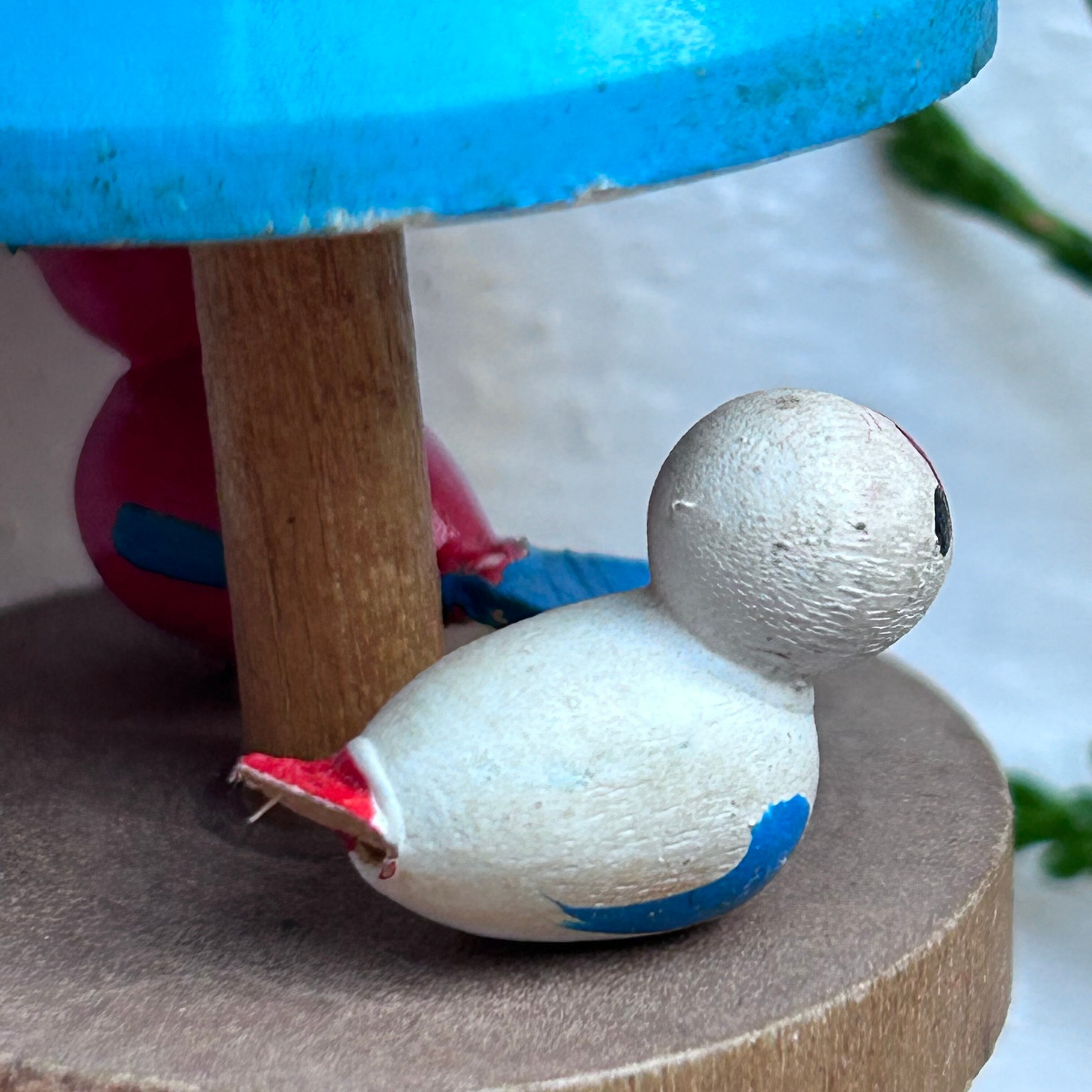 赤い鳥と白い鳥が青い屋根の下に。白い鳥の羽根が折れてなくなっています。